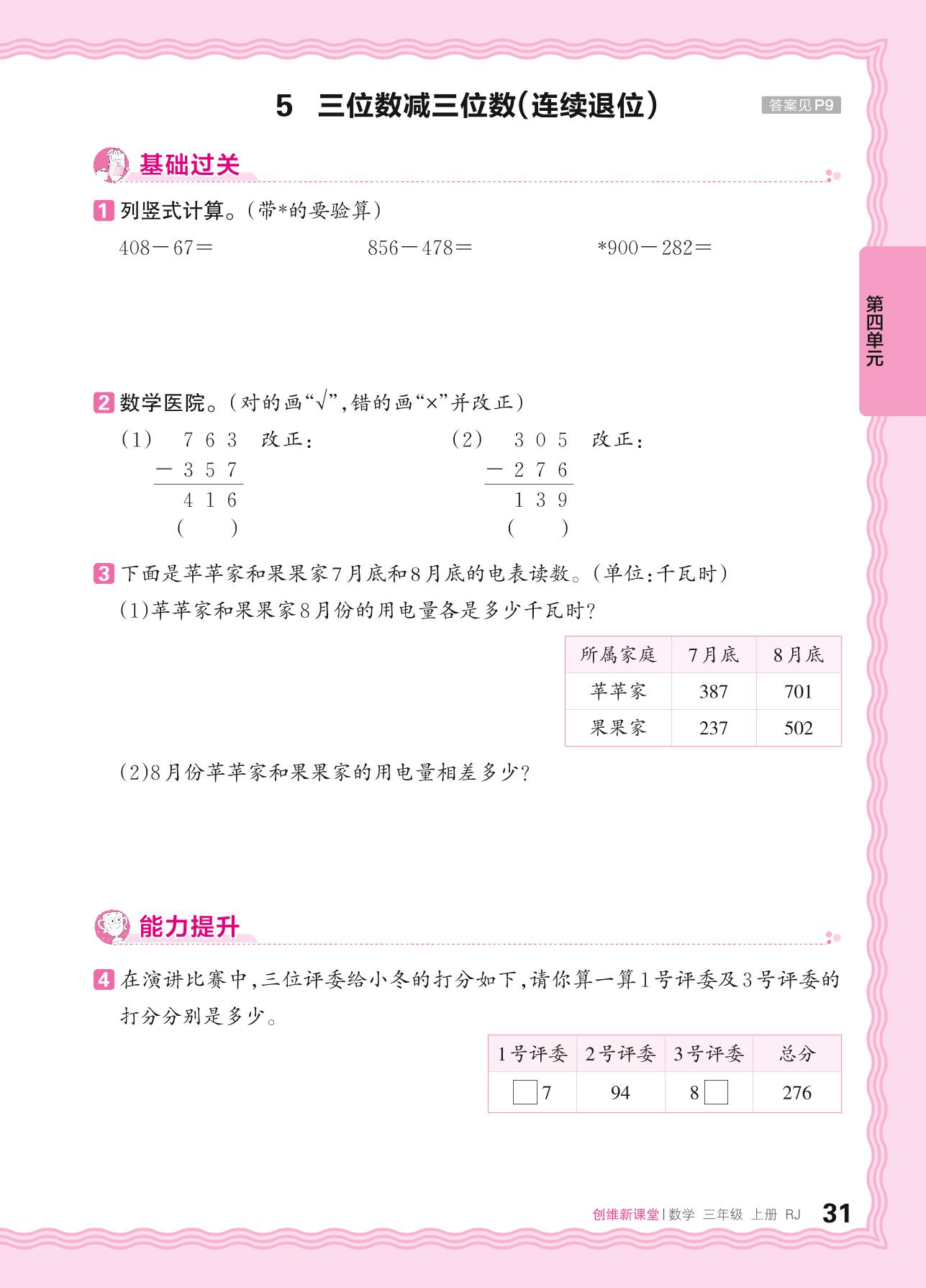 2024秋上册三年级数学人教版 第四单元 万以内的加法和减法(二)——5. 三位数减三位数(连续退位)