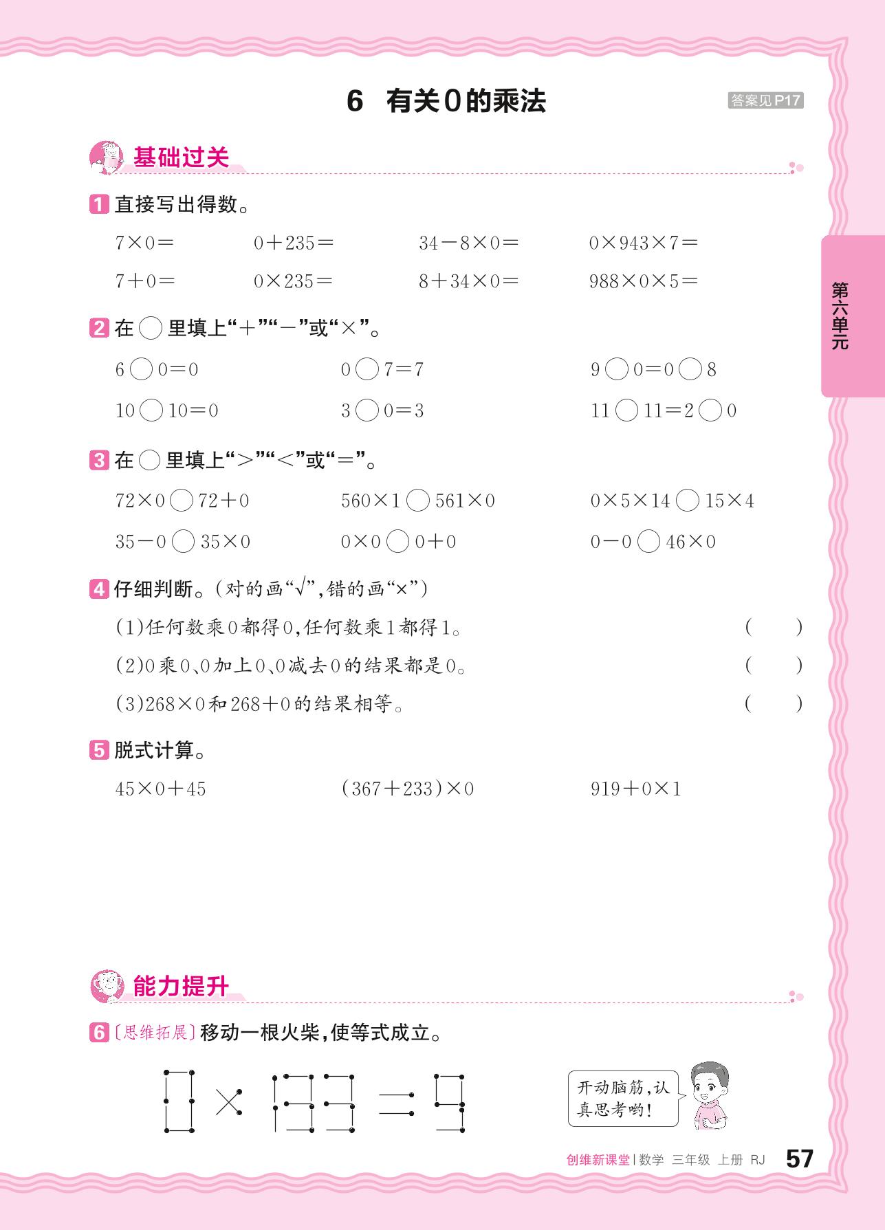 2024秋上册三年级数学人教版 第六单元 多位数乘一位数——6. 有关0的乘法