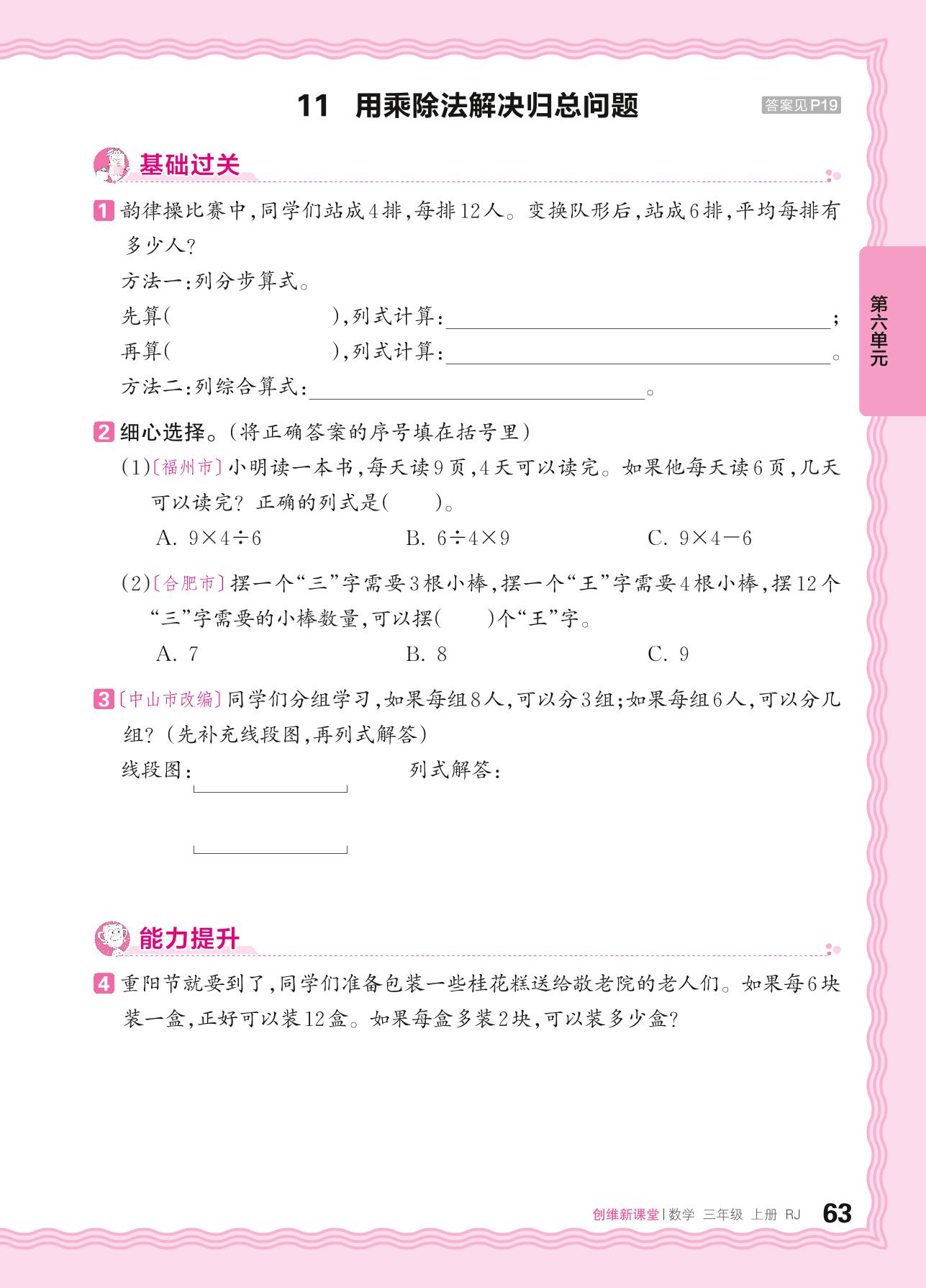 2024秋上册三年级数学人教版 第六单元 多位数乘一位数——11. 用乘除法解决归总问题