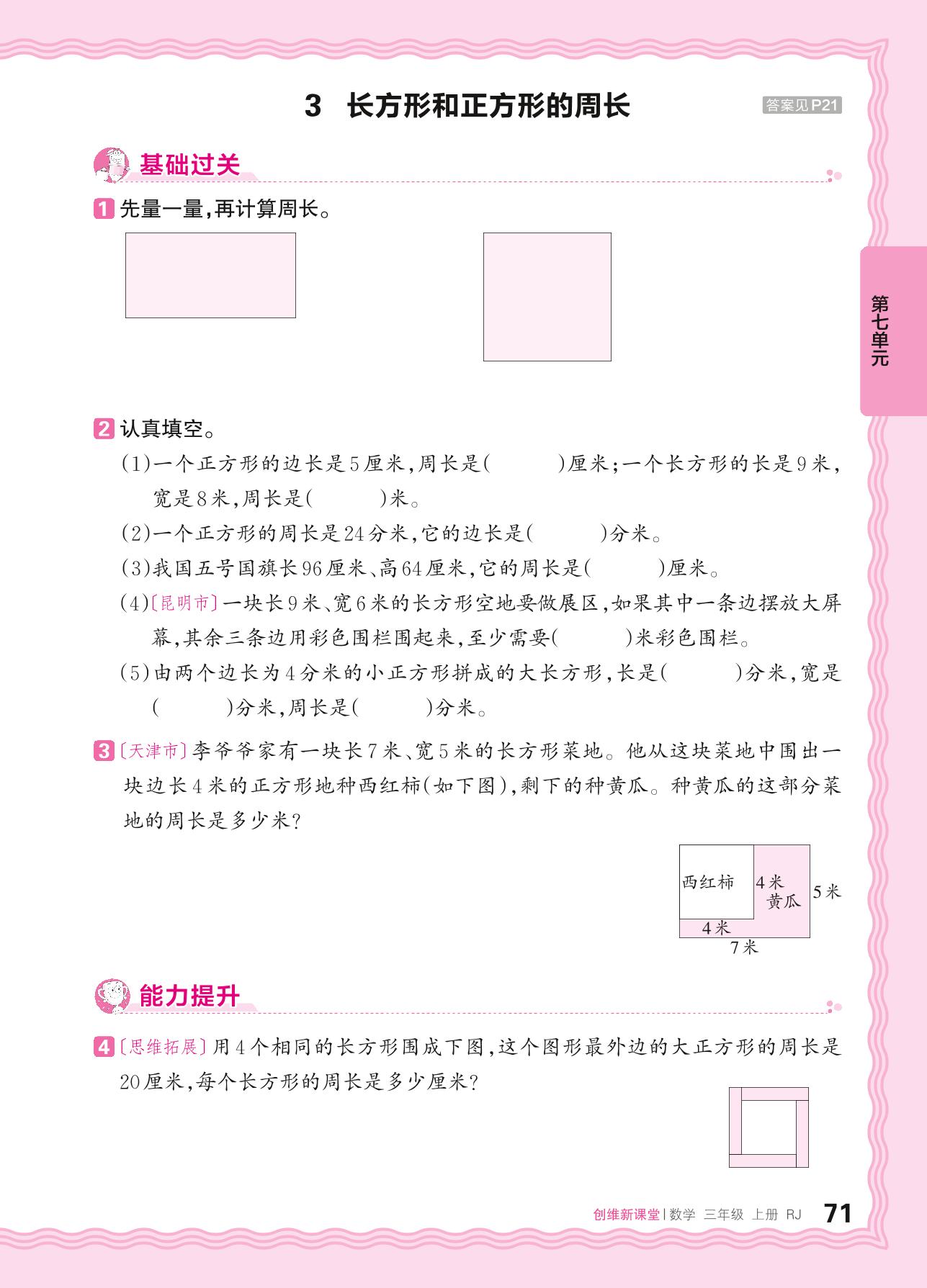 2024秋上册三年级数学人教版 第七单元 长方形和正方形——3. 长方形和正方形的周长