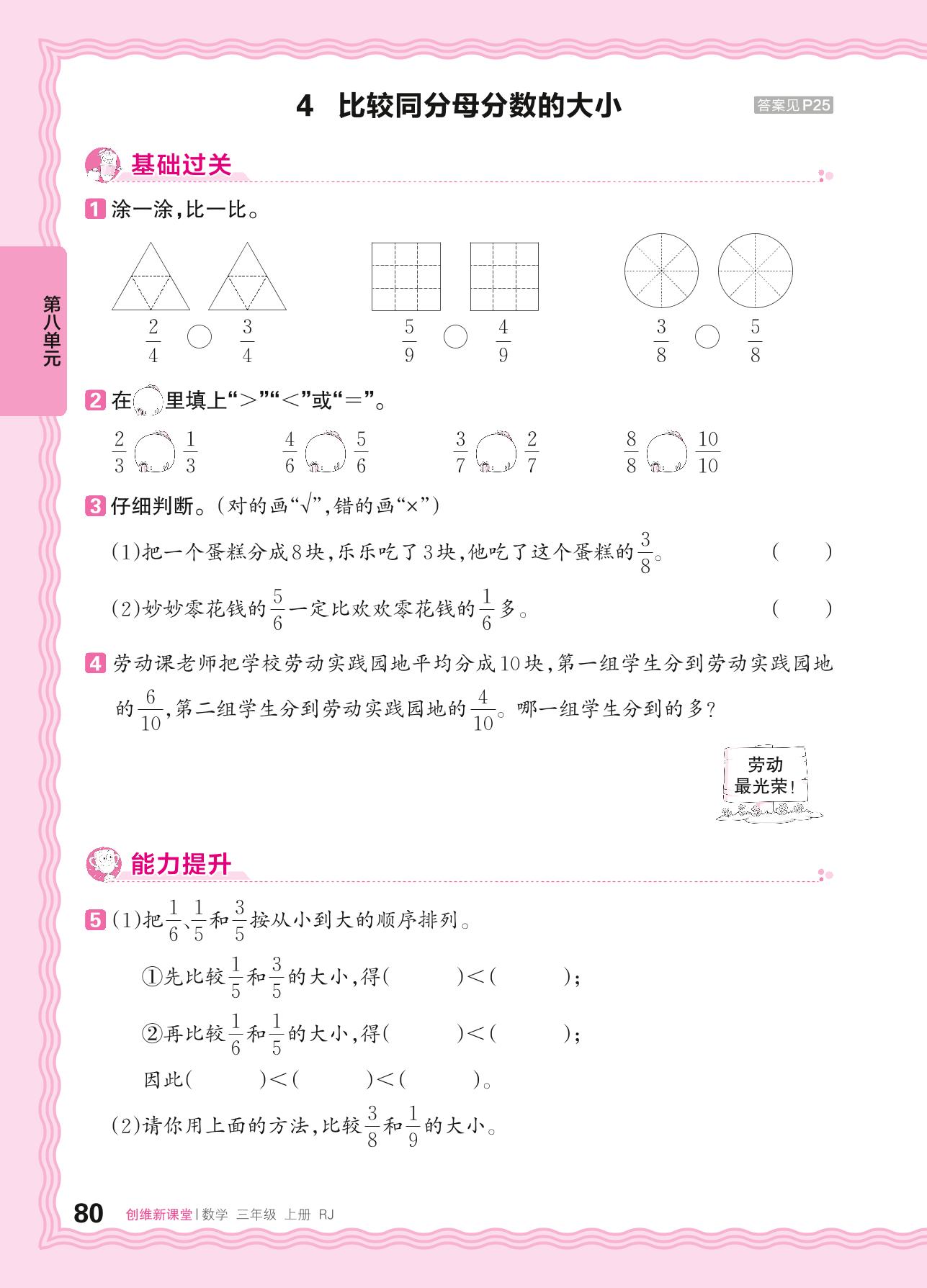 2024秋上册三年级数学人教版 第八单元 分数的初步认识——4. 比较同分母分数的大小