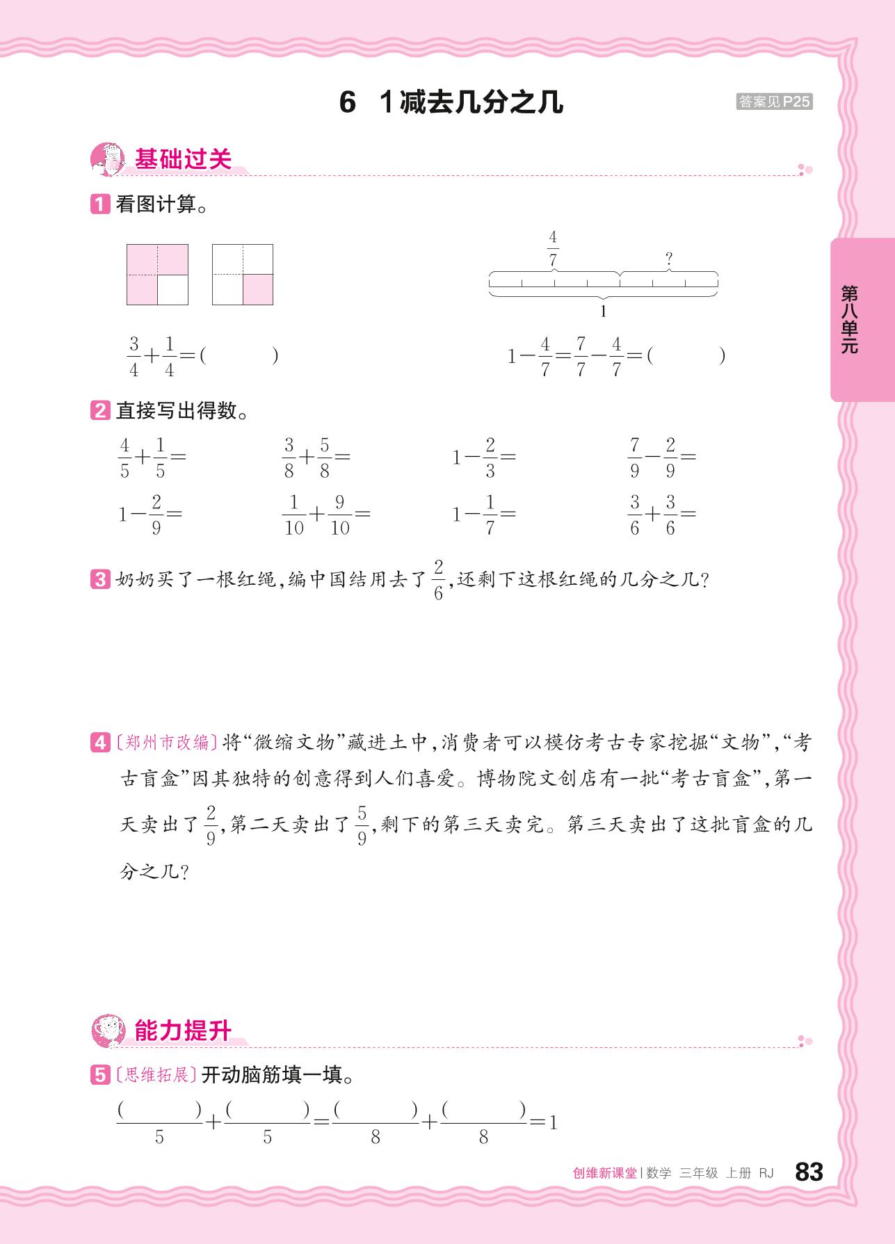 2024秋上册三年级数学人教版 第八单元 分数的初步认识——6. 1减去几分之几