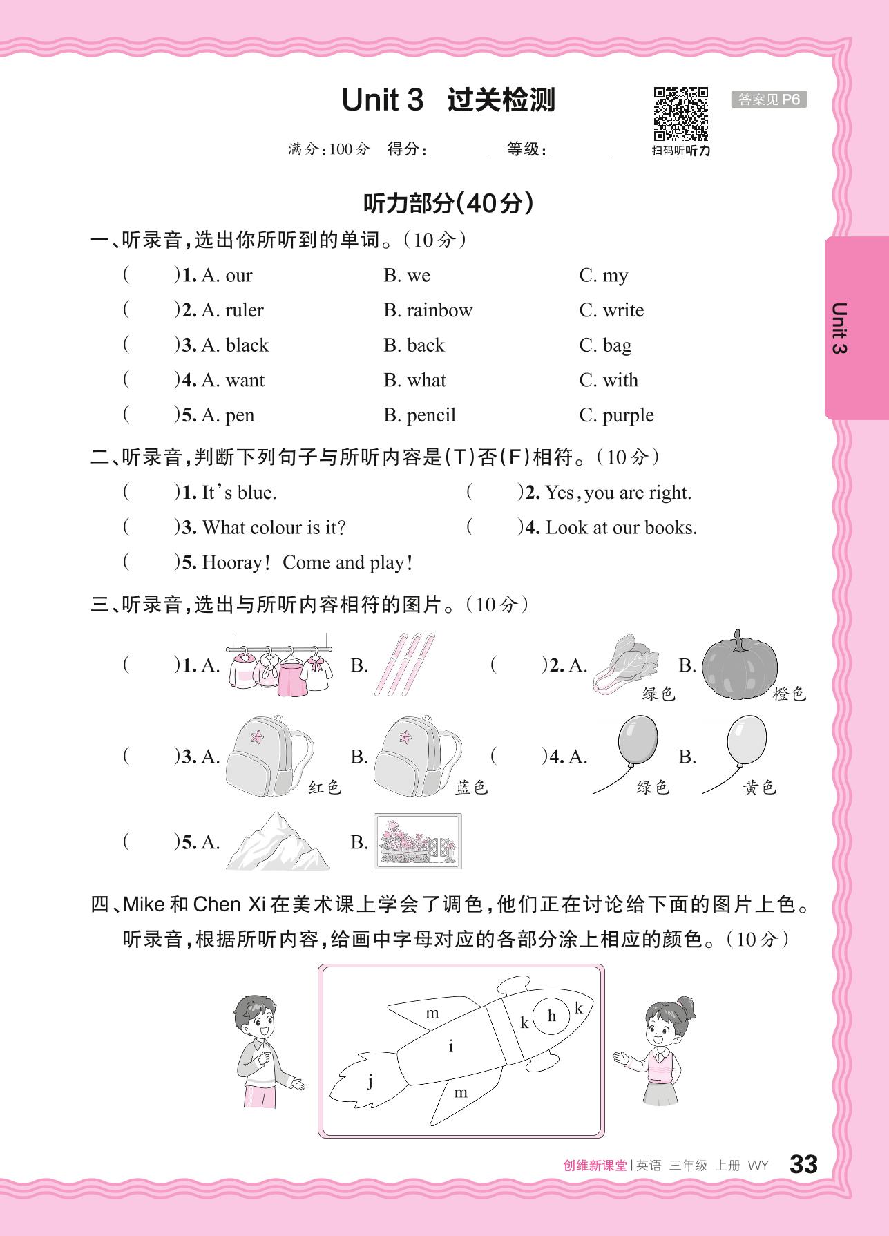 2024秋上册三年级英语外研版(三起始) Unit 3 过关检测