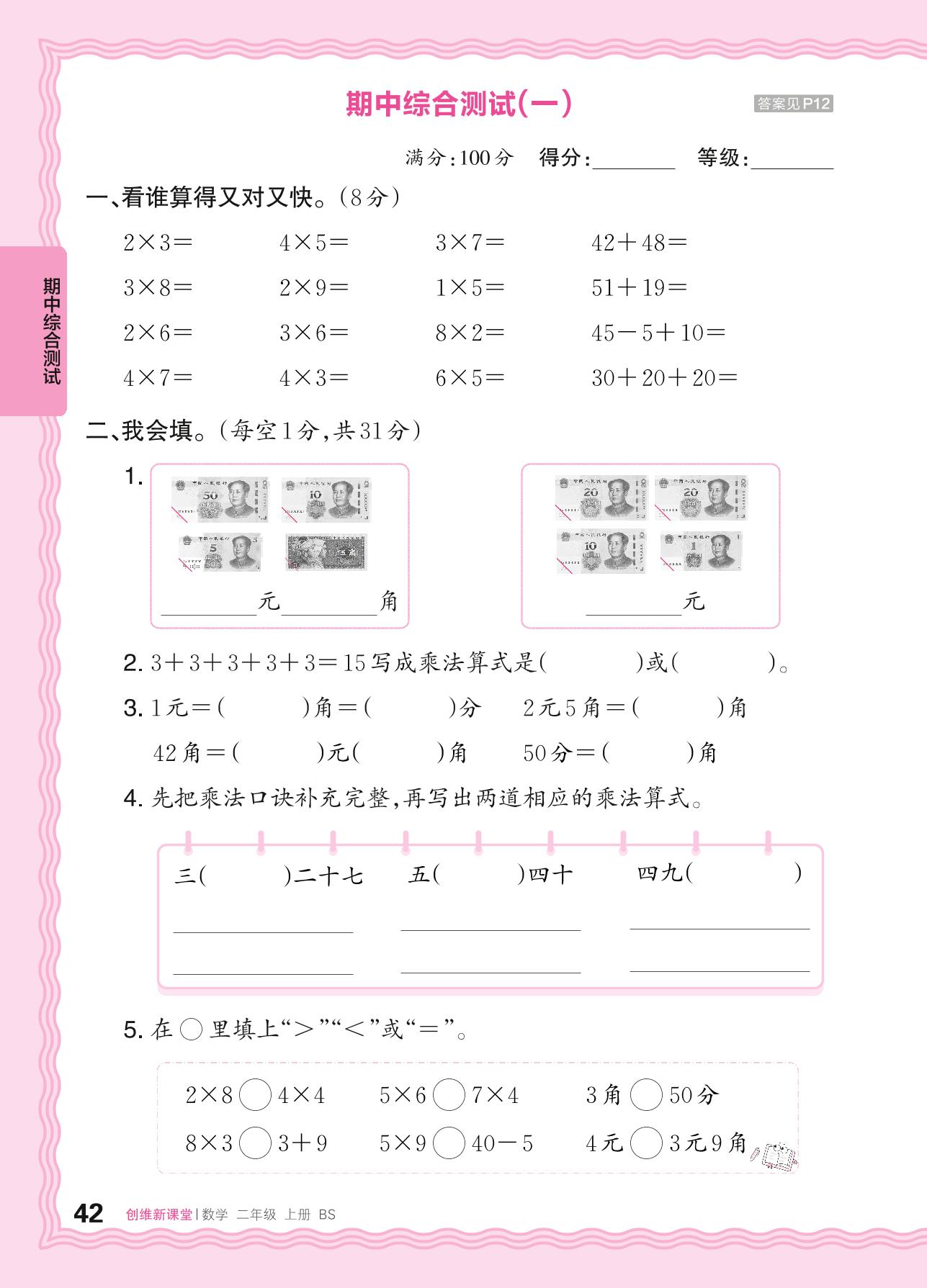2024秋上册二年级数学北师版 期中综合测试(一)
