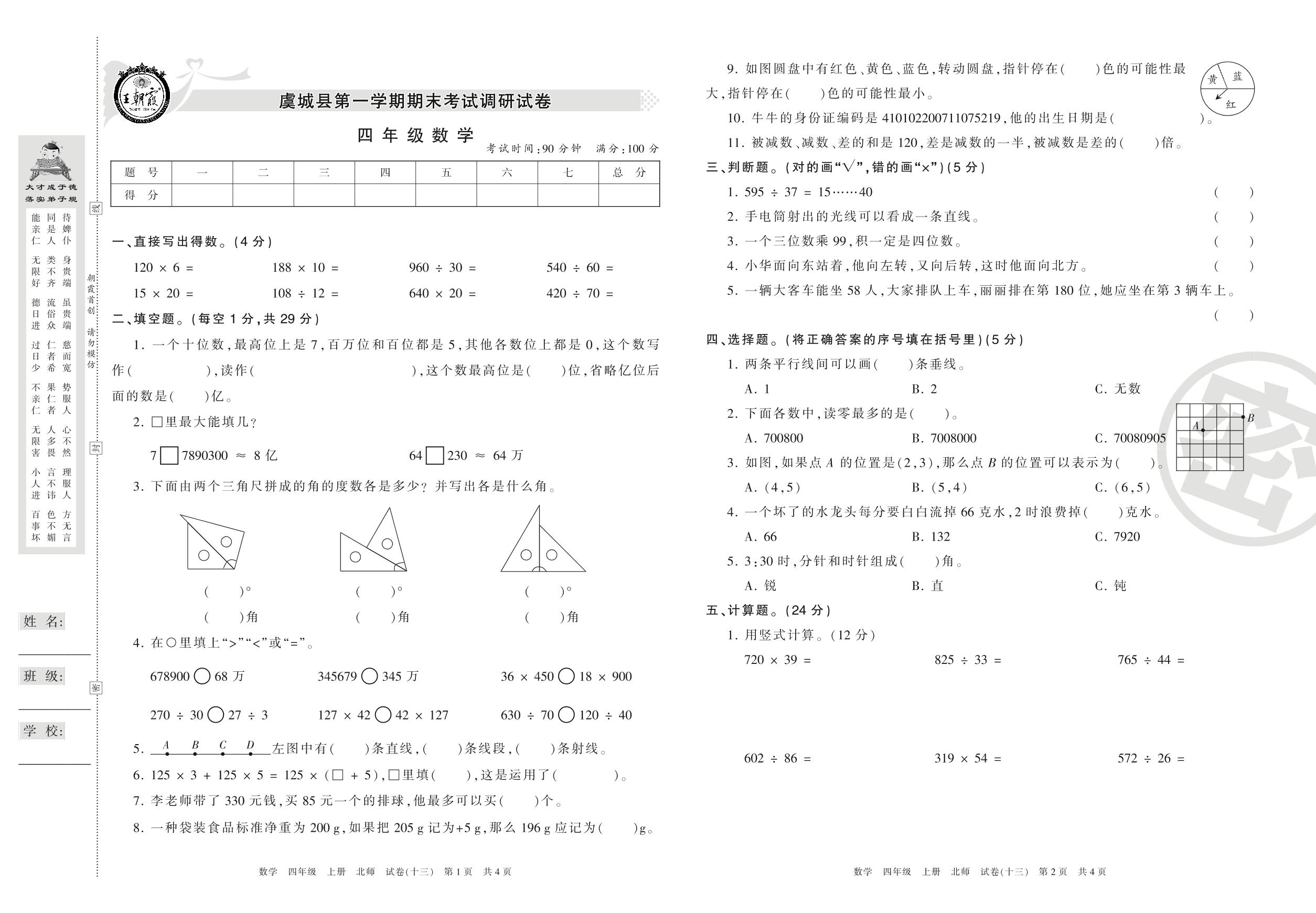 2016-2017学年第一学期商丘市虞城县四年级数学试卷(北师版)【13】