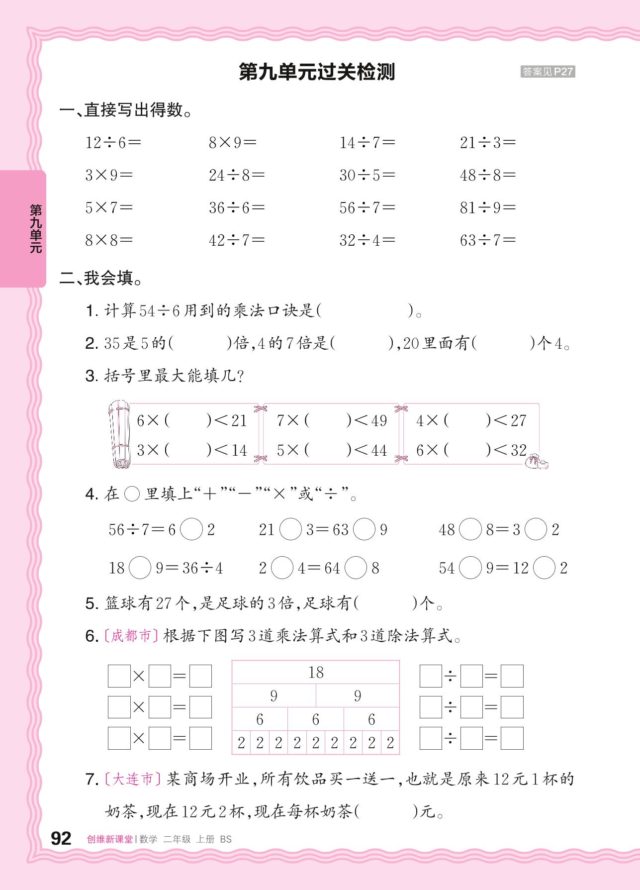 2024秋上册二年级数学北师版 第九单元过关检测