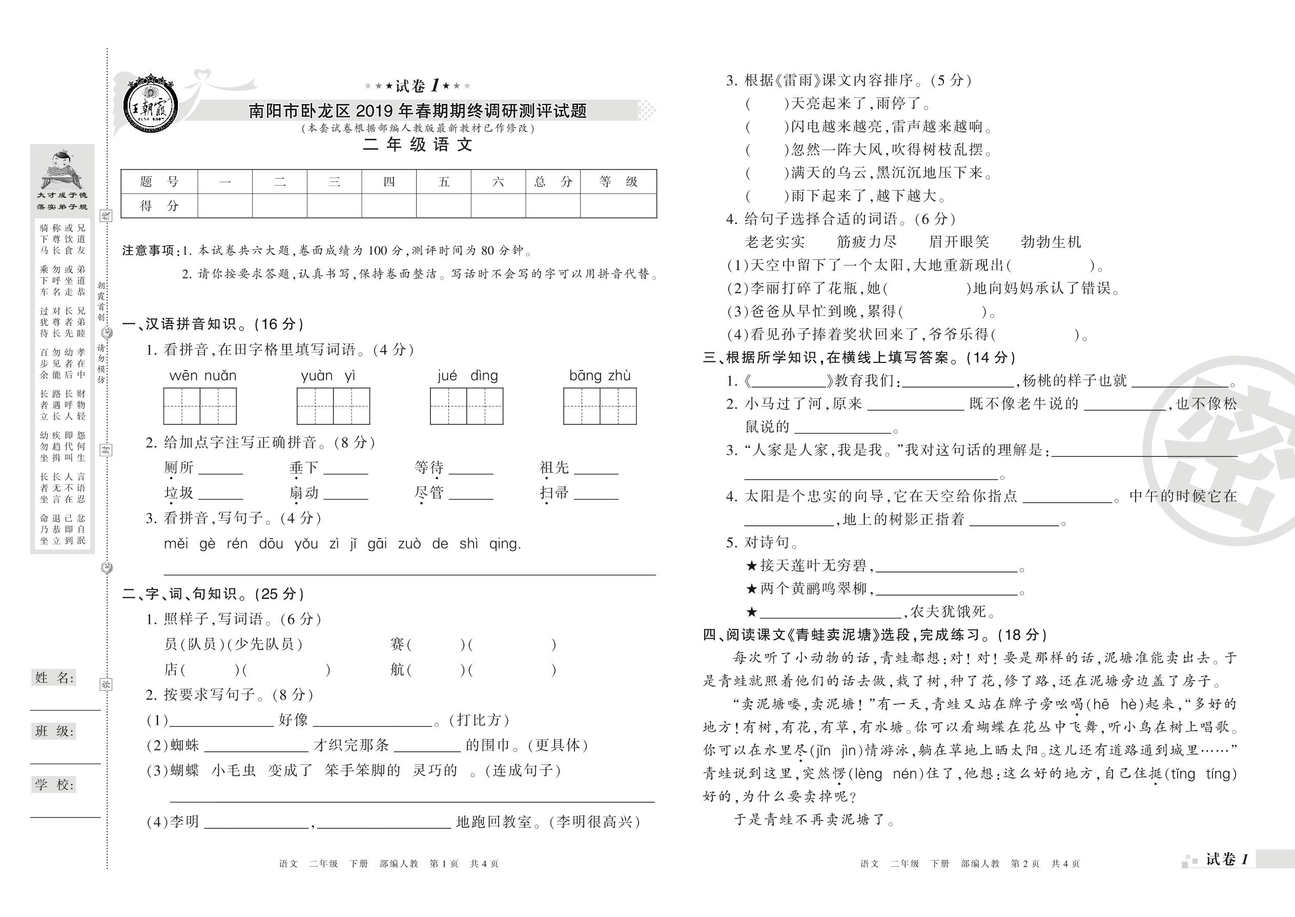 2018-2019学年第二学期南阳市卧龙区二年级语文试卷(人教版)【1】