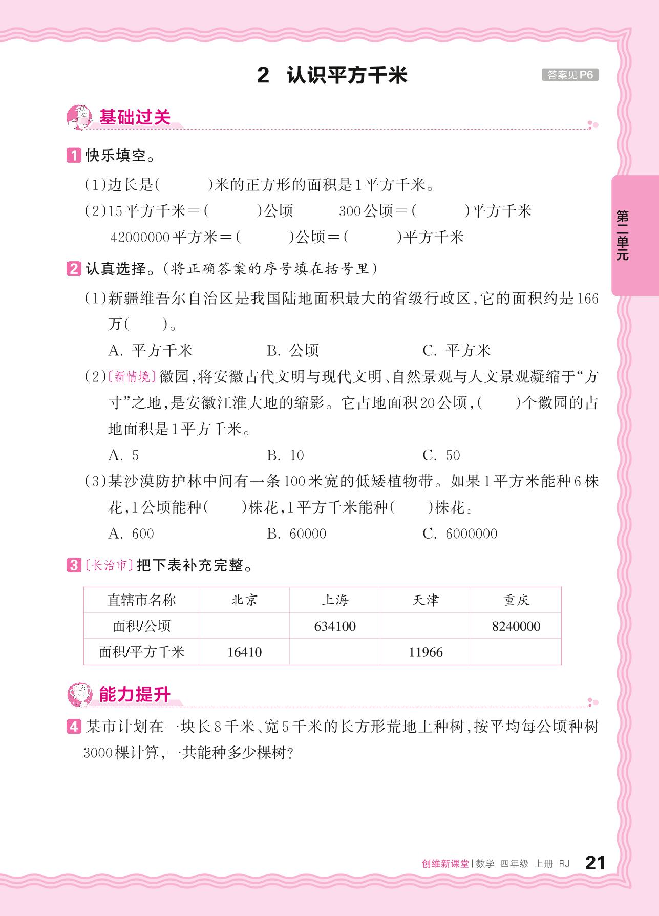 2024秋上册四年级数学人教版 第二单元 公顷和平方千米——2. 认识平方千米