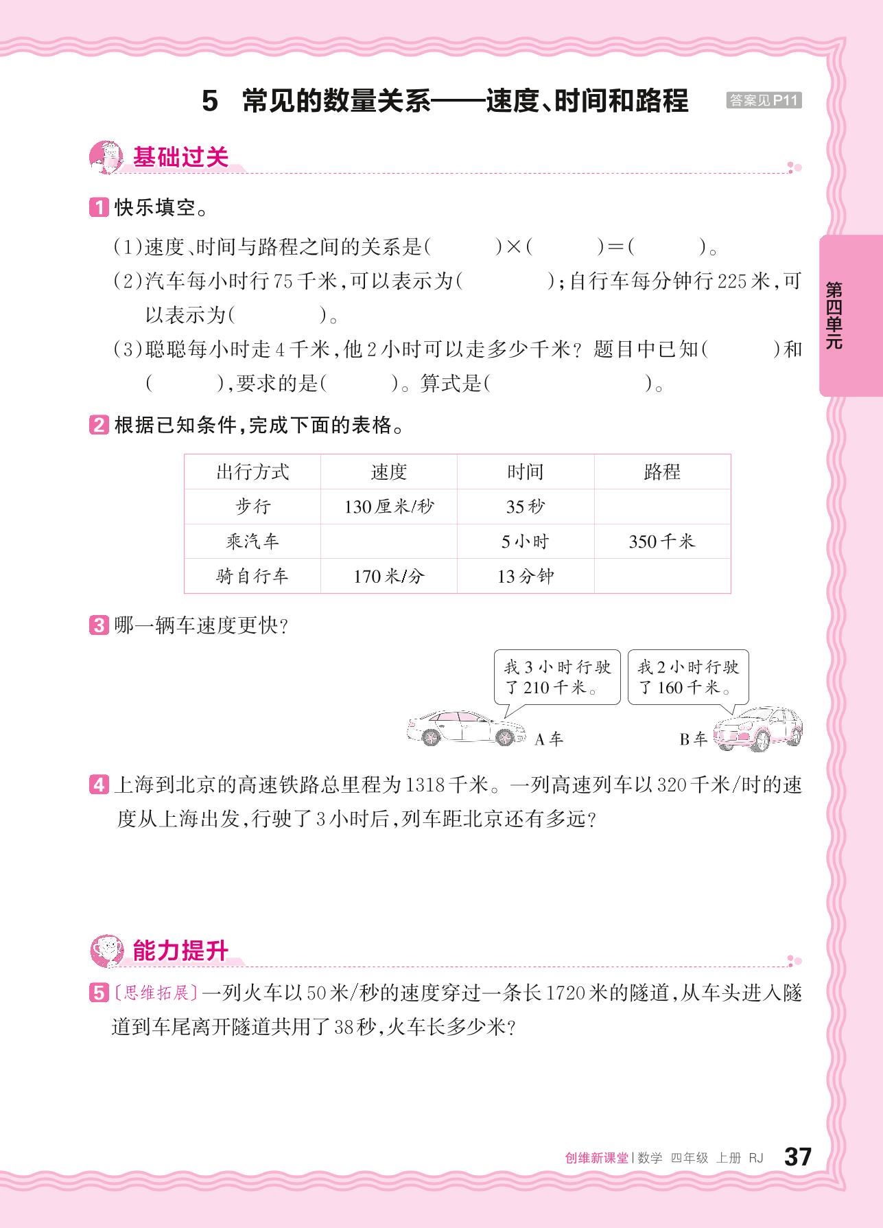 2024秋上册四年级数学人教版 第四单元 三位数乘两位数——5. 常见的数量关系——速度、时间和路程
