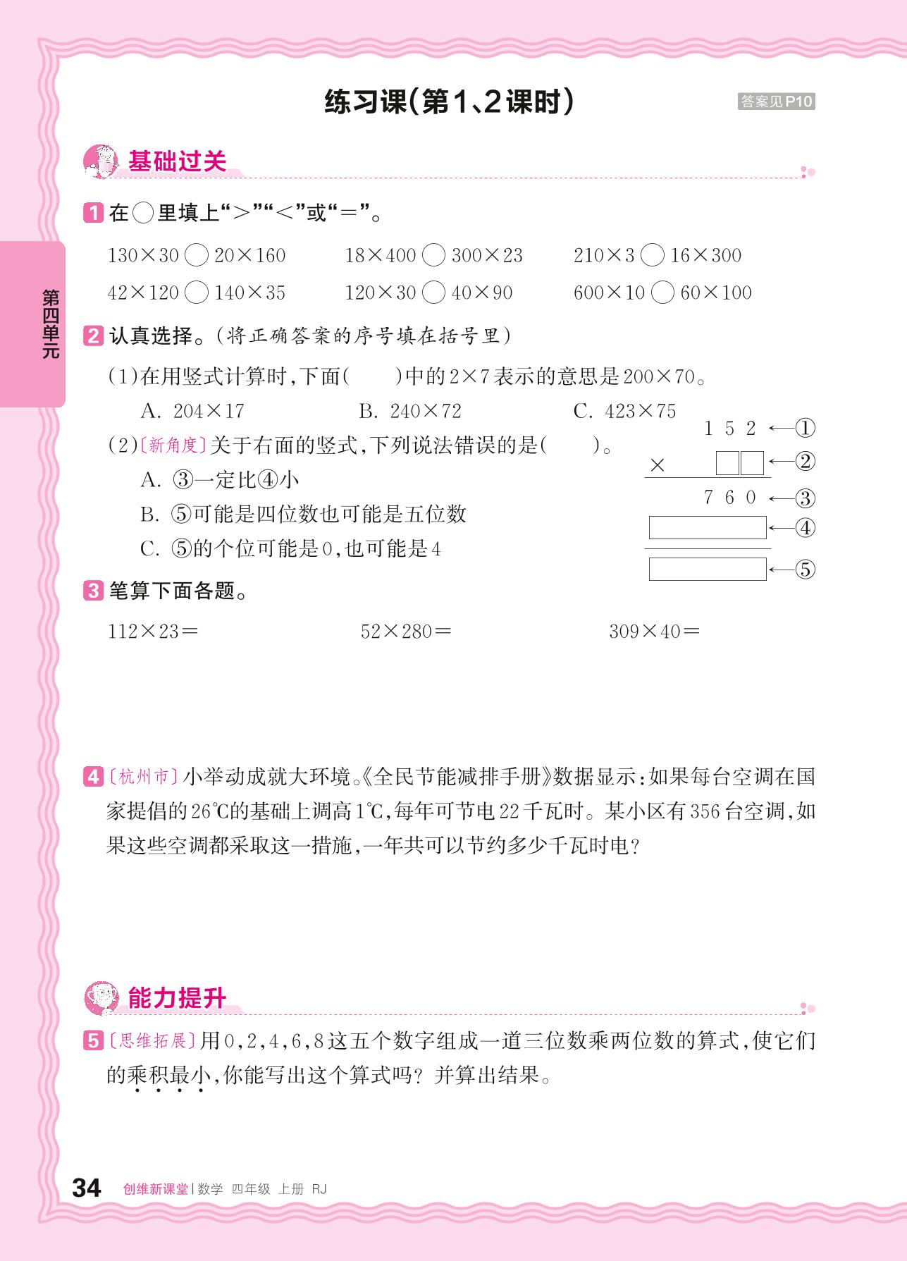 2024秋上册四年级数学人教版 第四单元 三位数乘两位数——三位数乘两位数的笔算及因数中间、末尾有0的乘法练习课