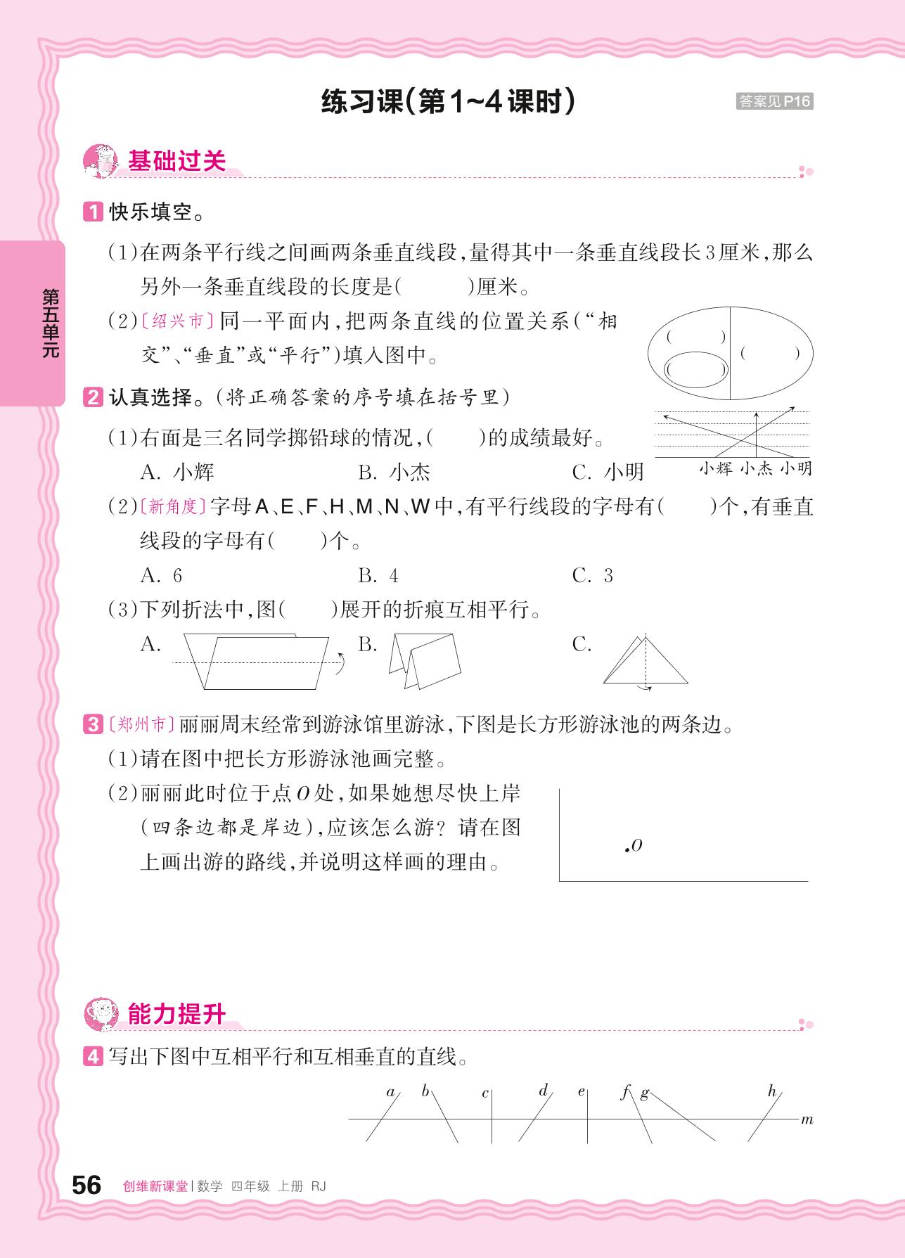 2024秋上册四年级数学人教版 第五单元 平行四边形和梯形——平行与垂直、画垂线、点到直线的距离、画长方形练习课
