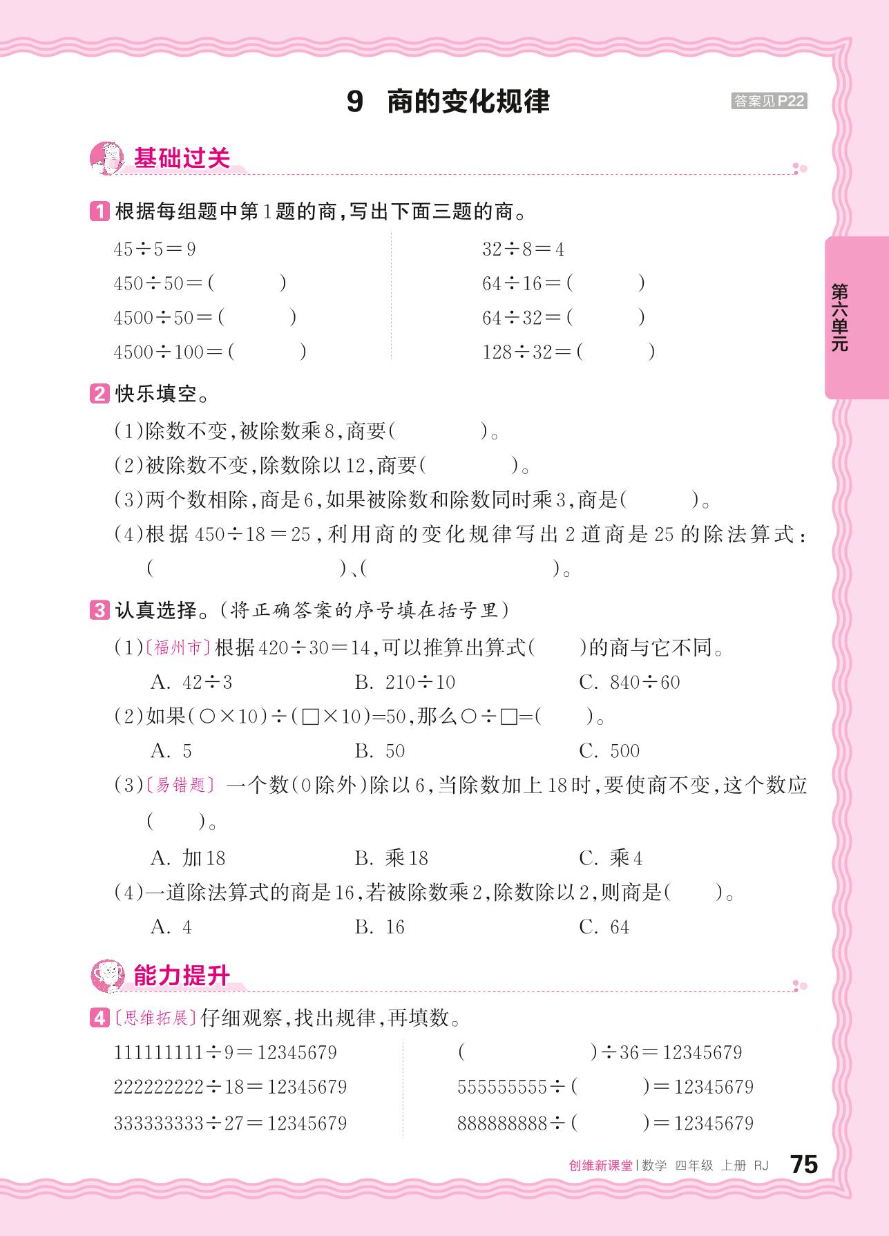 2024秋上册四年级数学人教版 第六单元 除数是两位数的除法——9. 商的变化规律