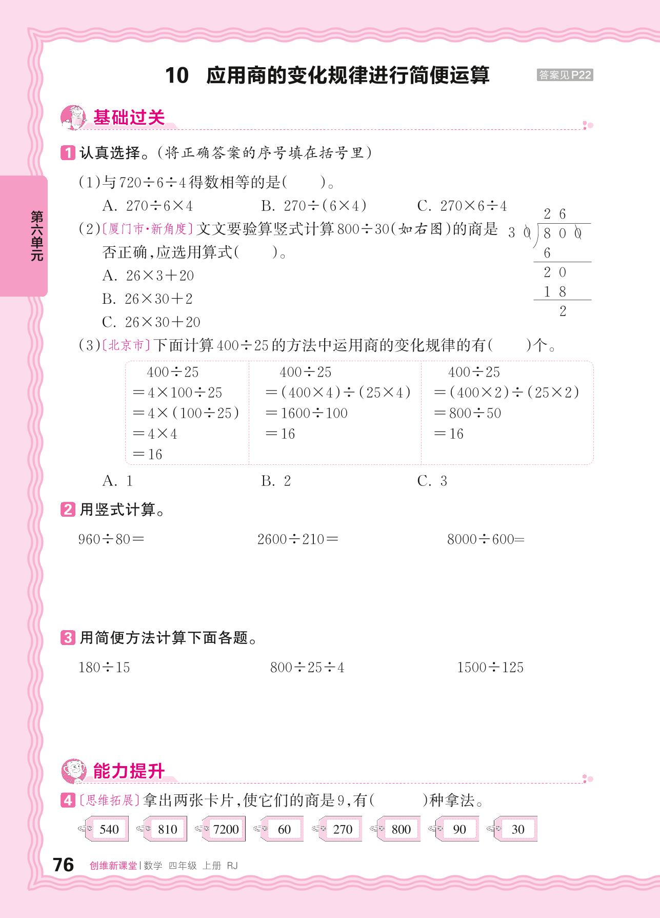 2024秋上册四年级数学人教版 第六单元 除数是两位数的除法——10. 应用商的变化规律进行简便运算