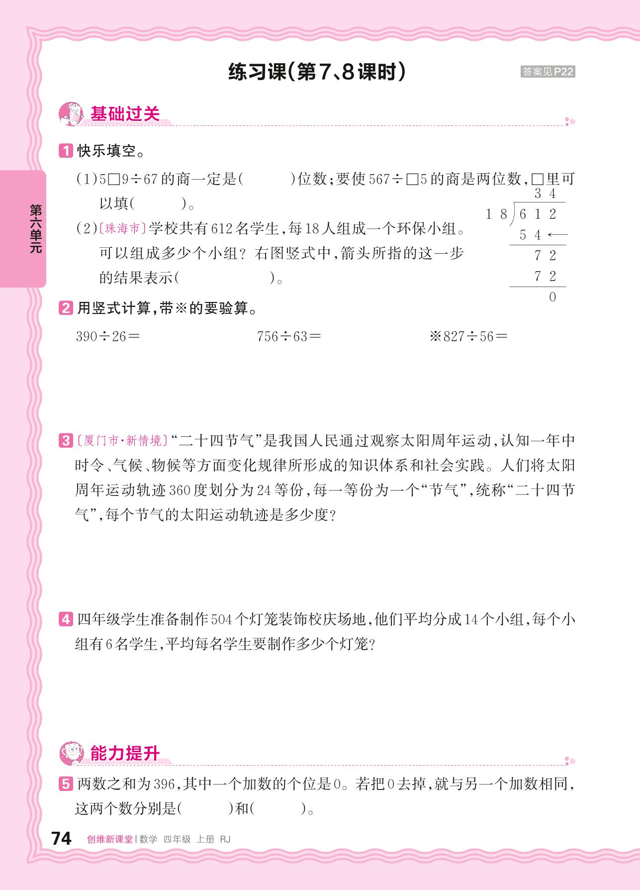 2024秋上册四年级数学人教版 第六单元 除数是两位数的除法——商是两位数的笔算除法练习课