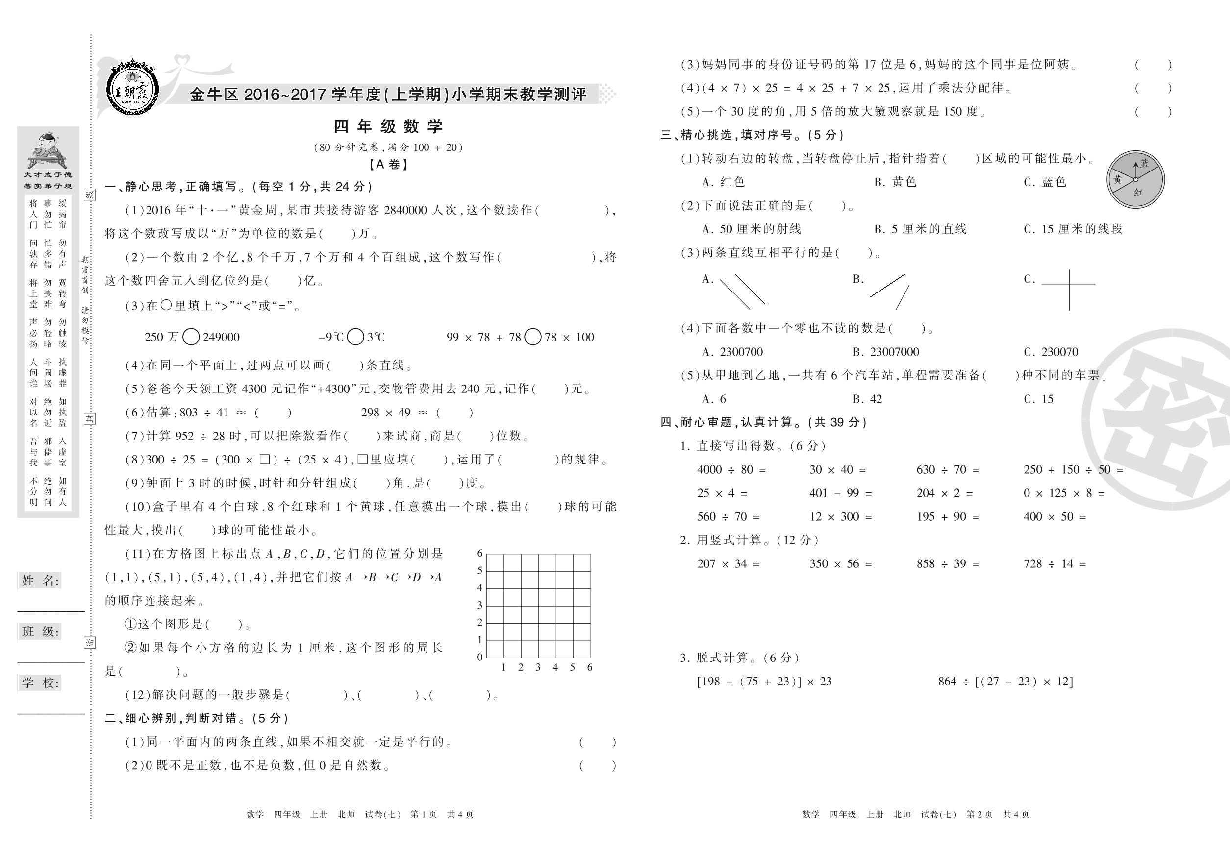 2016-2017学年第一学期成都市金牛区四年级数学试卷(北师版)【7】