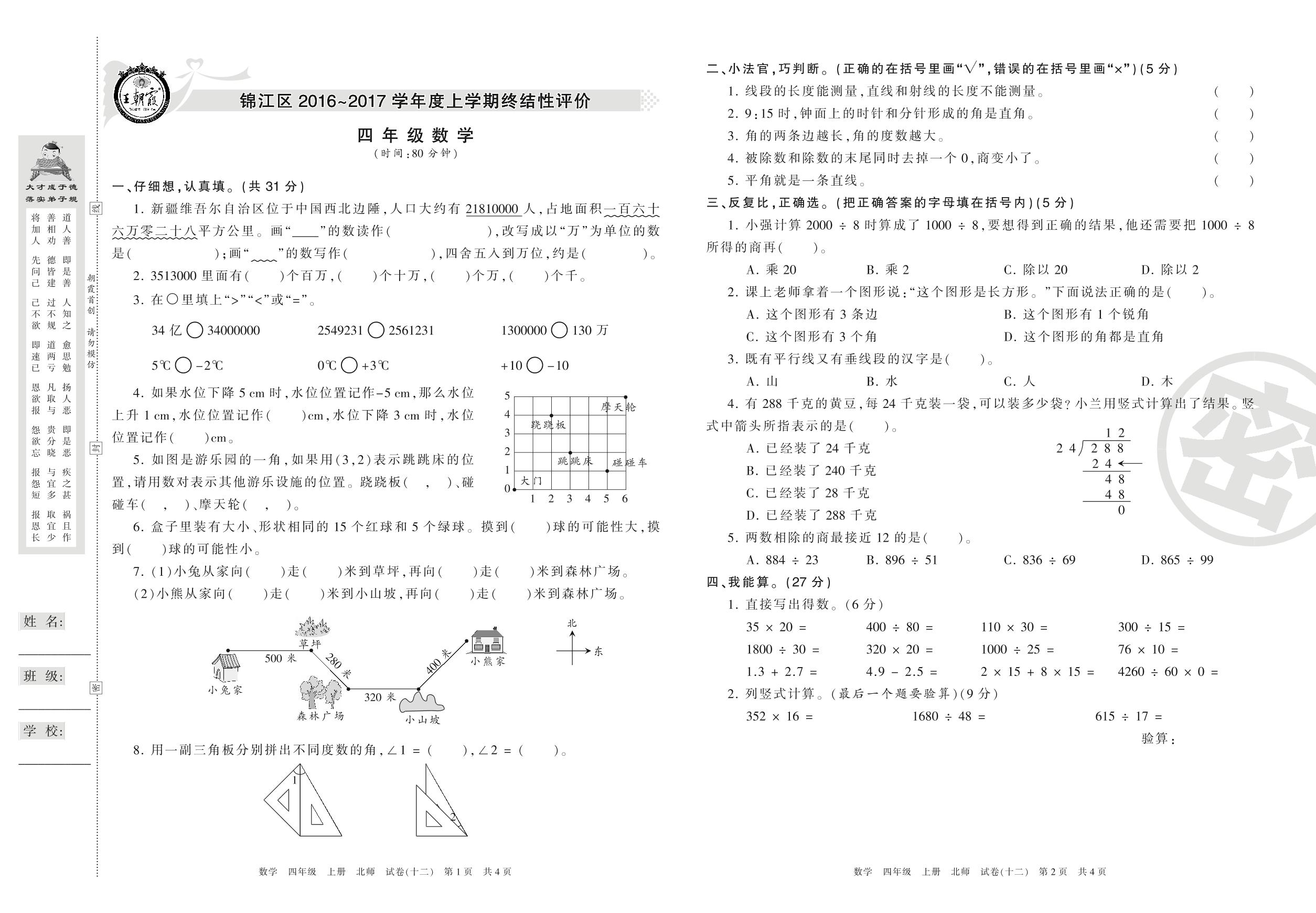 2016-2017学年第一学期成都市锦江区四年级数学试卷(北师版)【12】