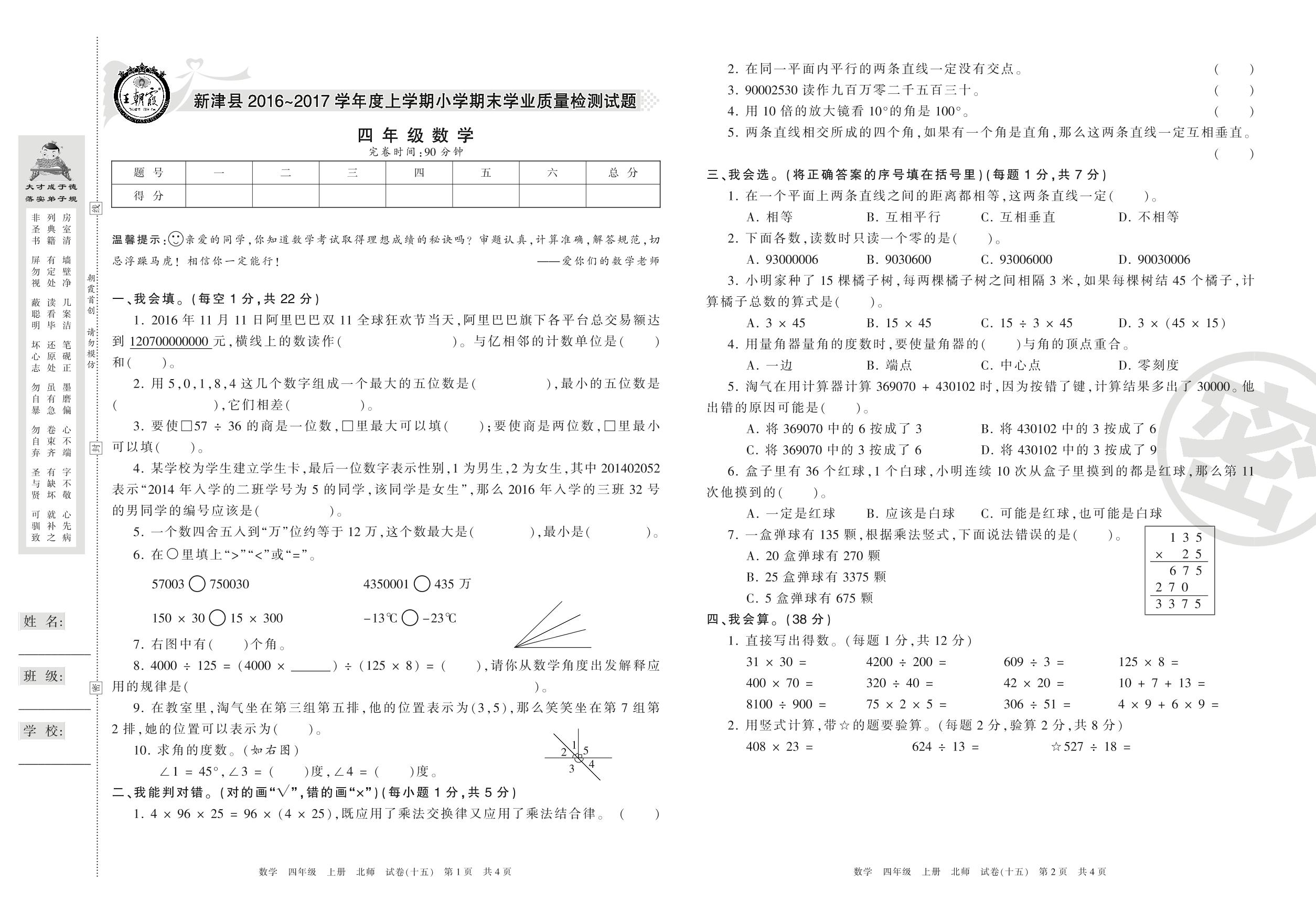 四年级数学北师版上册期末卷