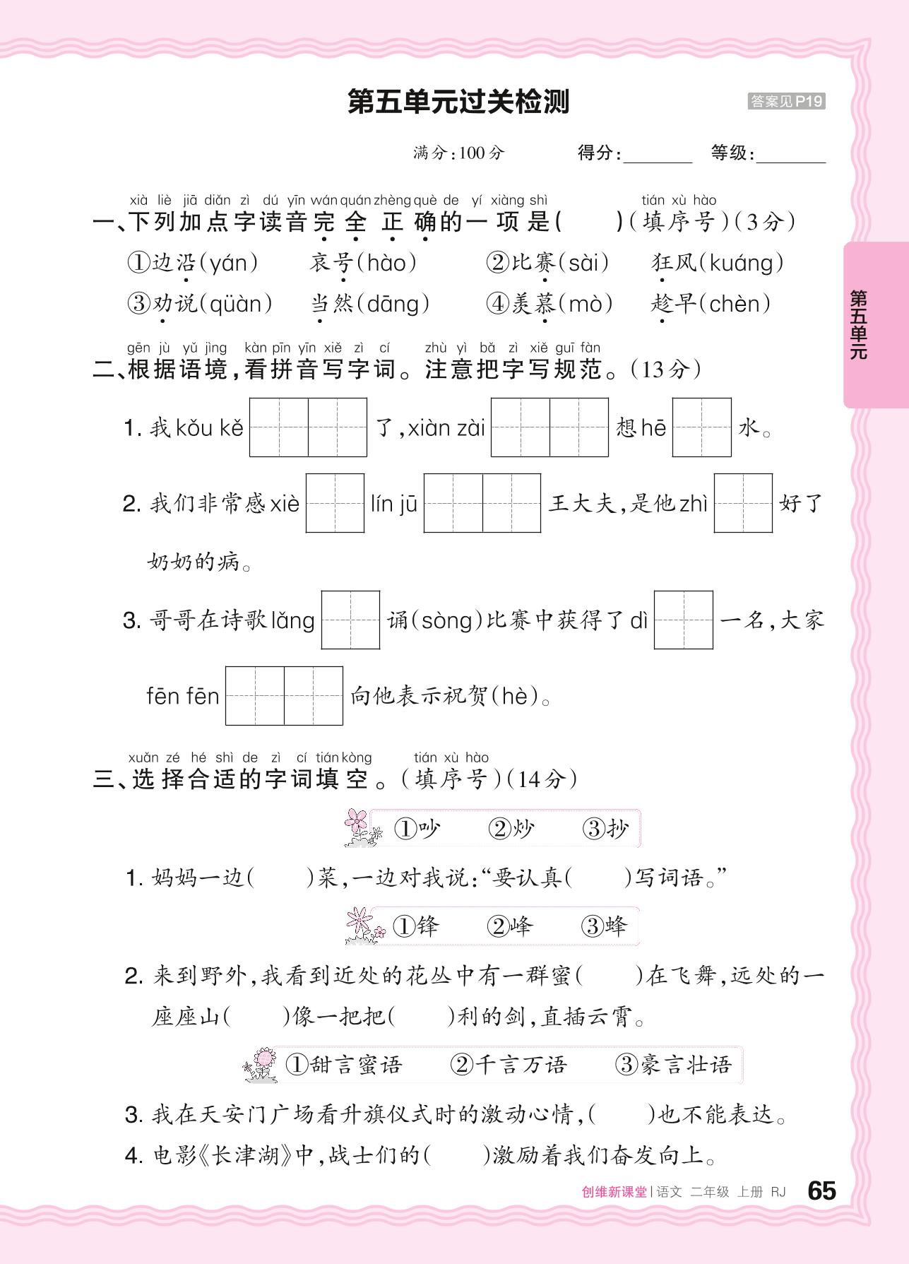 2024秋上册二年级语文人教版 第五单元过关检测