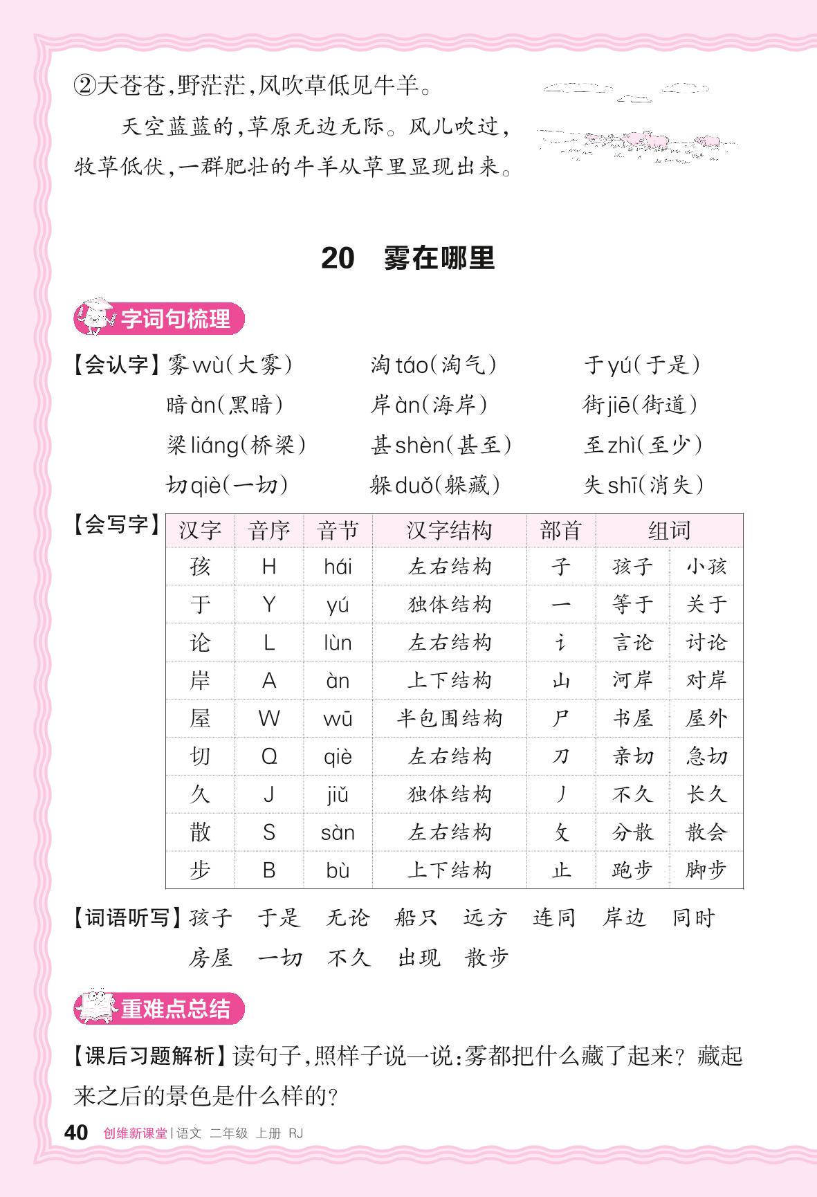 2024秋上册二年级语文人教版 助学手册 第七单元——20. 雾在哪里