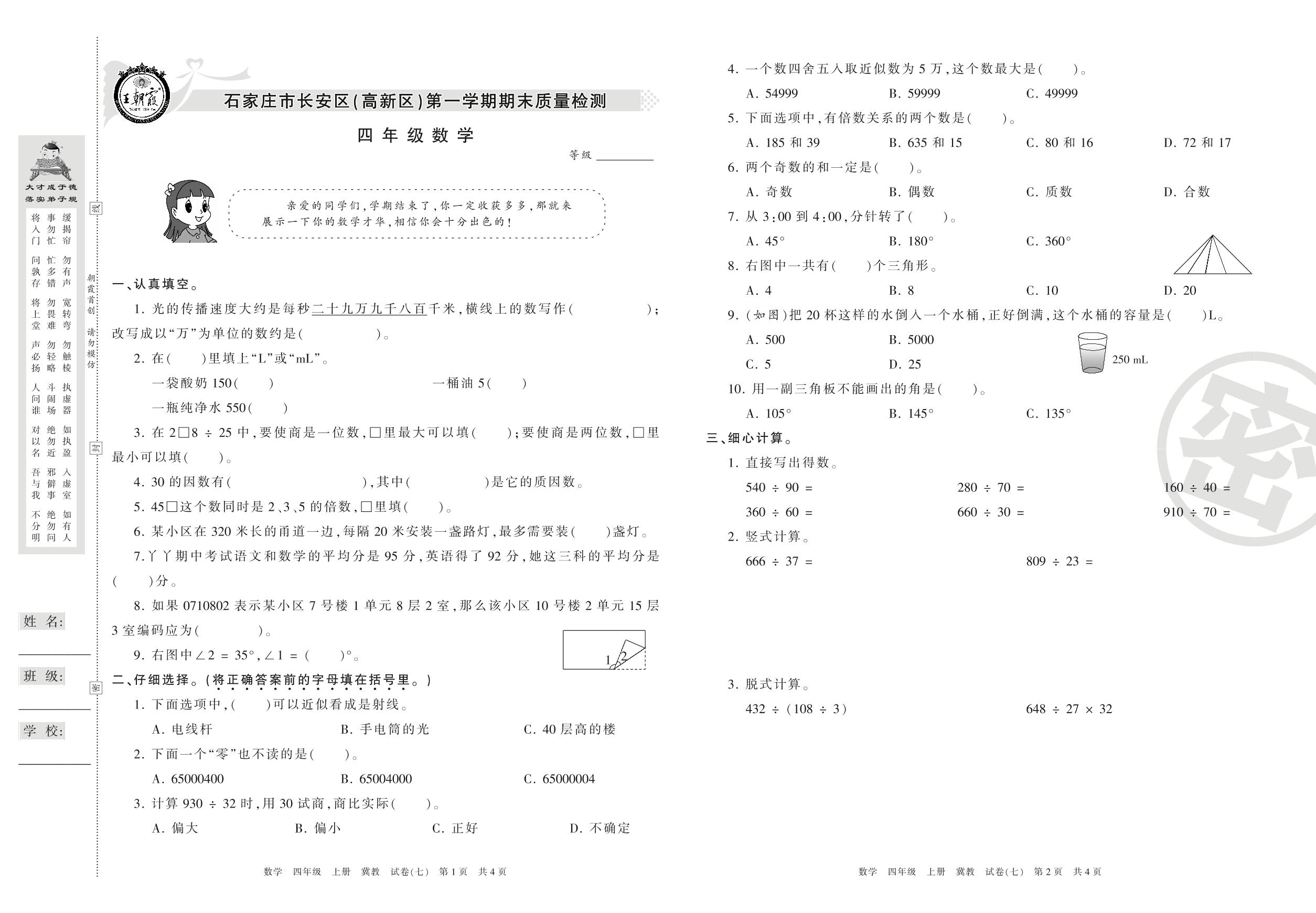 2016-2017学年第一学期石家庄市长安区(高新区)四年级数学试卷(冀教版)【7】