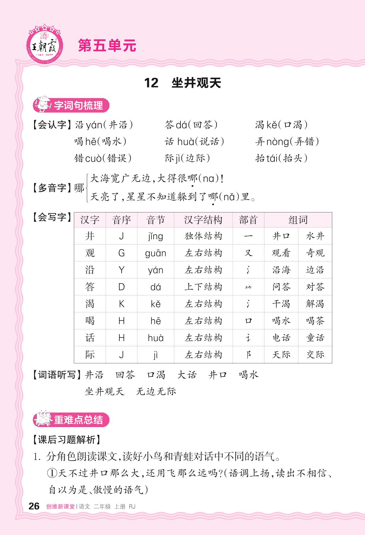 2024秋上册二年级语文人教版 助学手册 第五单元——12. 坐井观天
