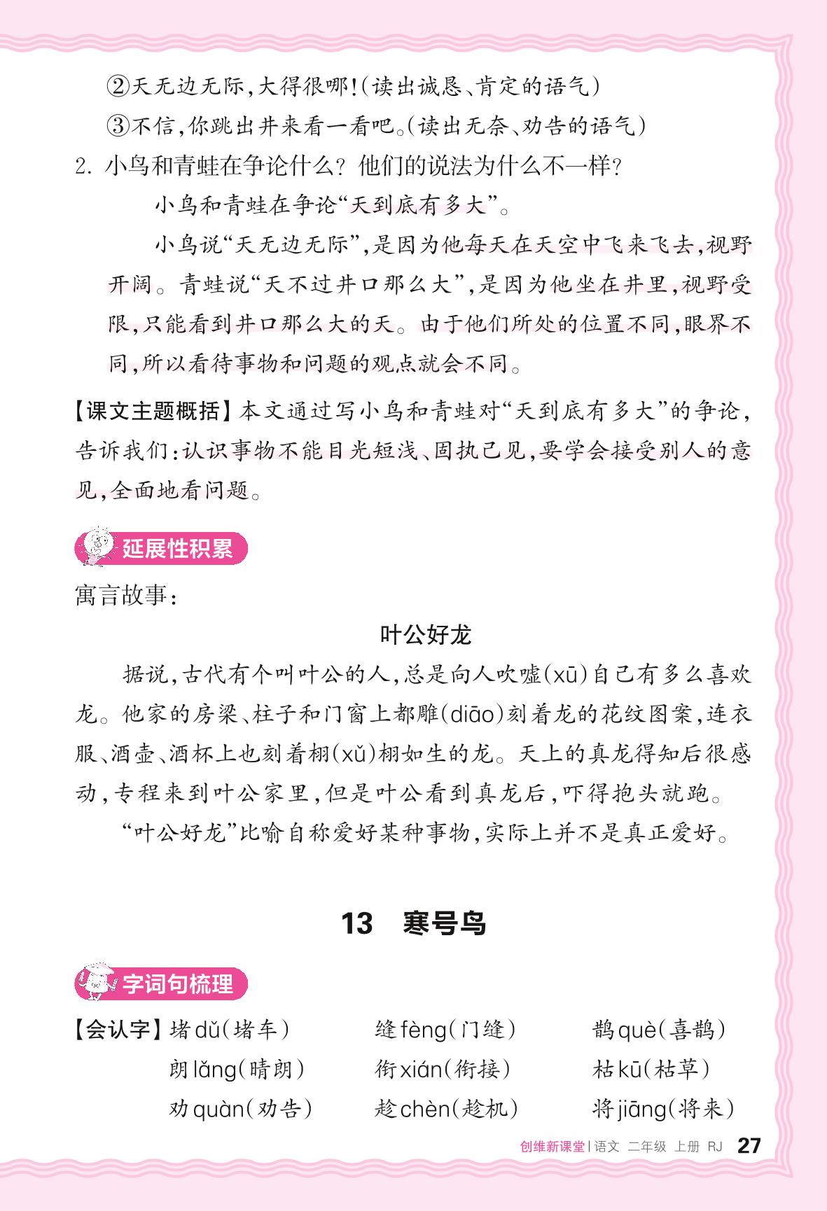 2024秋上册二年级语文人教版 助学手册 第五单元——13. 寒号鸟