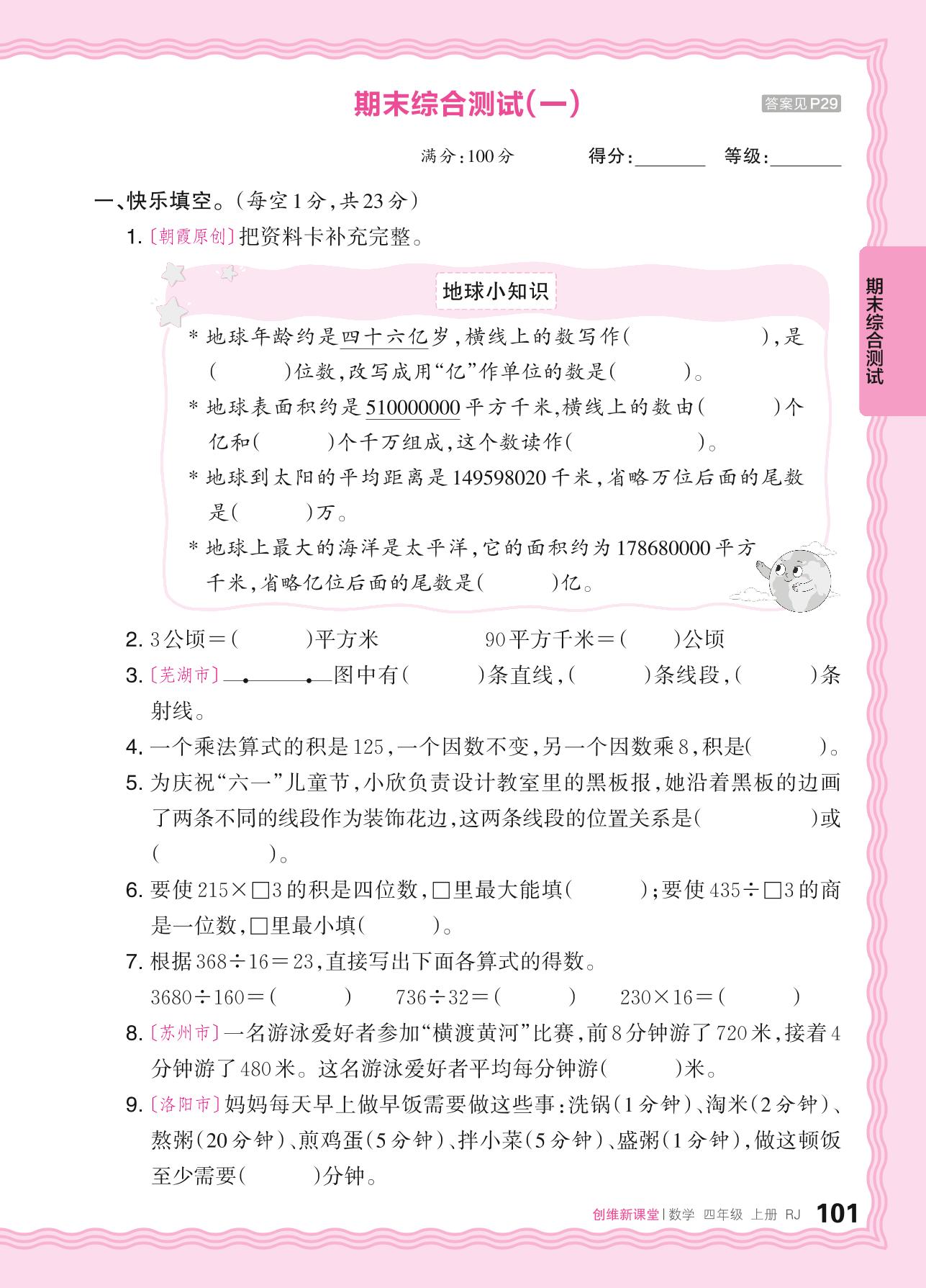 2024秋上册四年级数学人教版 期末综合测试(一)