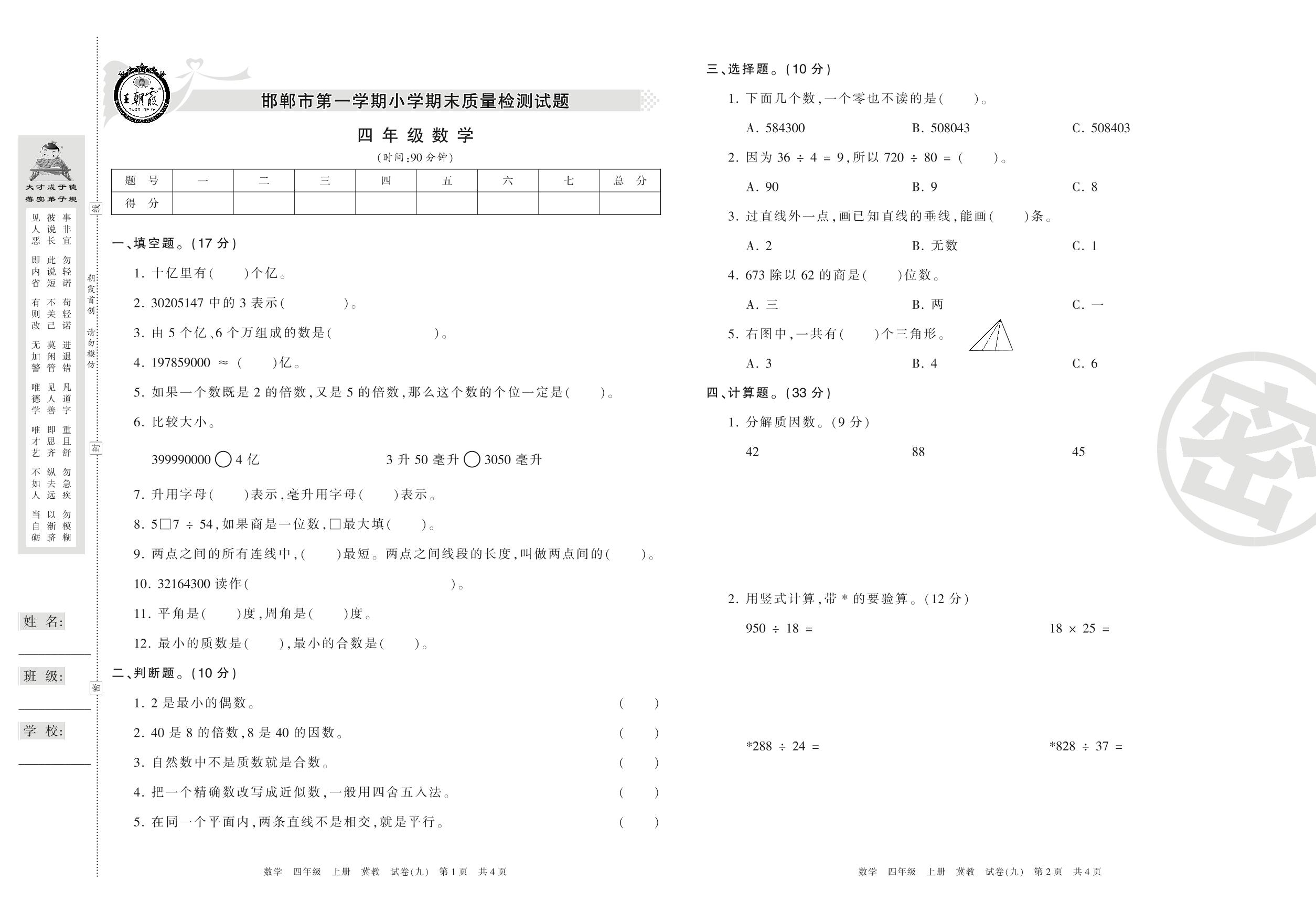 2016-2017学年第一学期邯郸市四年级数学试卷(冀教版)【9】
