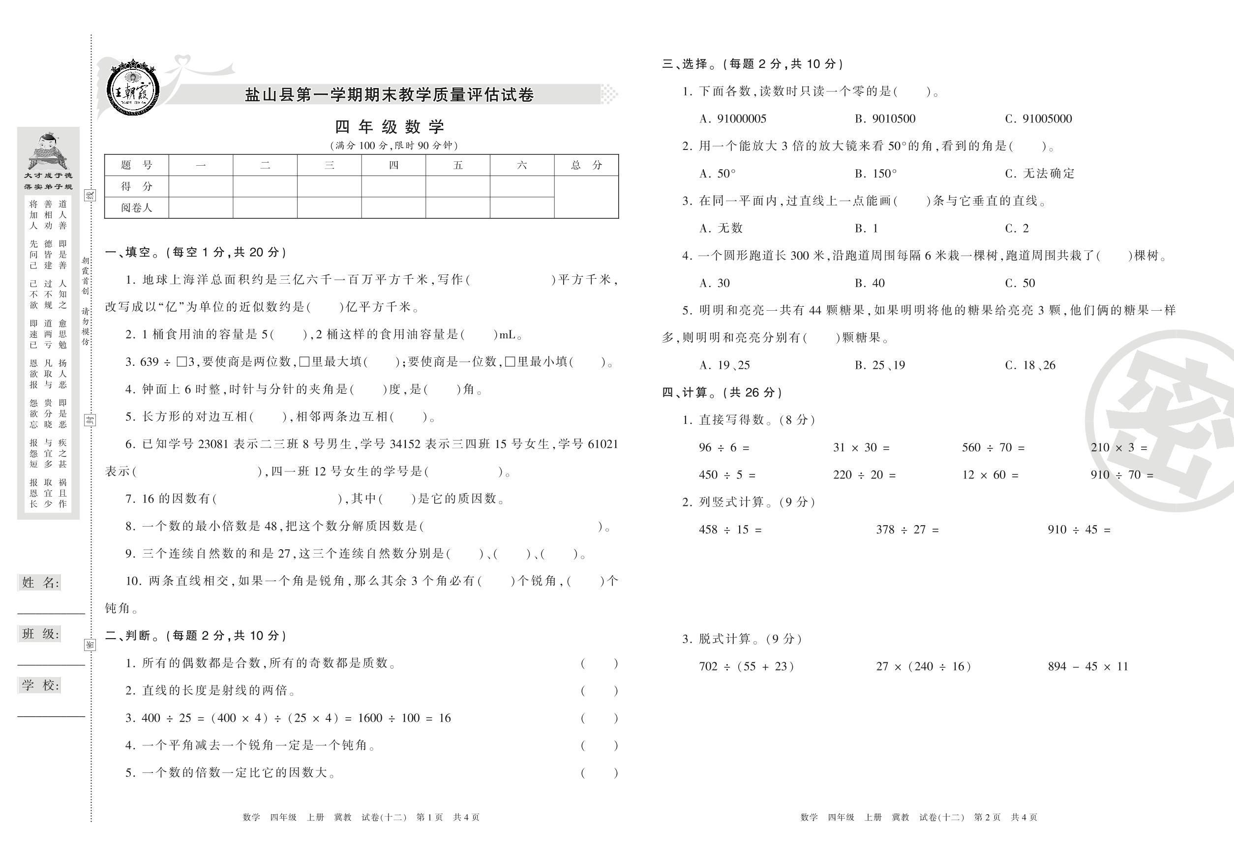 2016-2017学年第一学期沧州市盐山县四年级数学试卷(冀教版)【12】