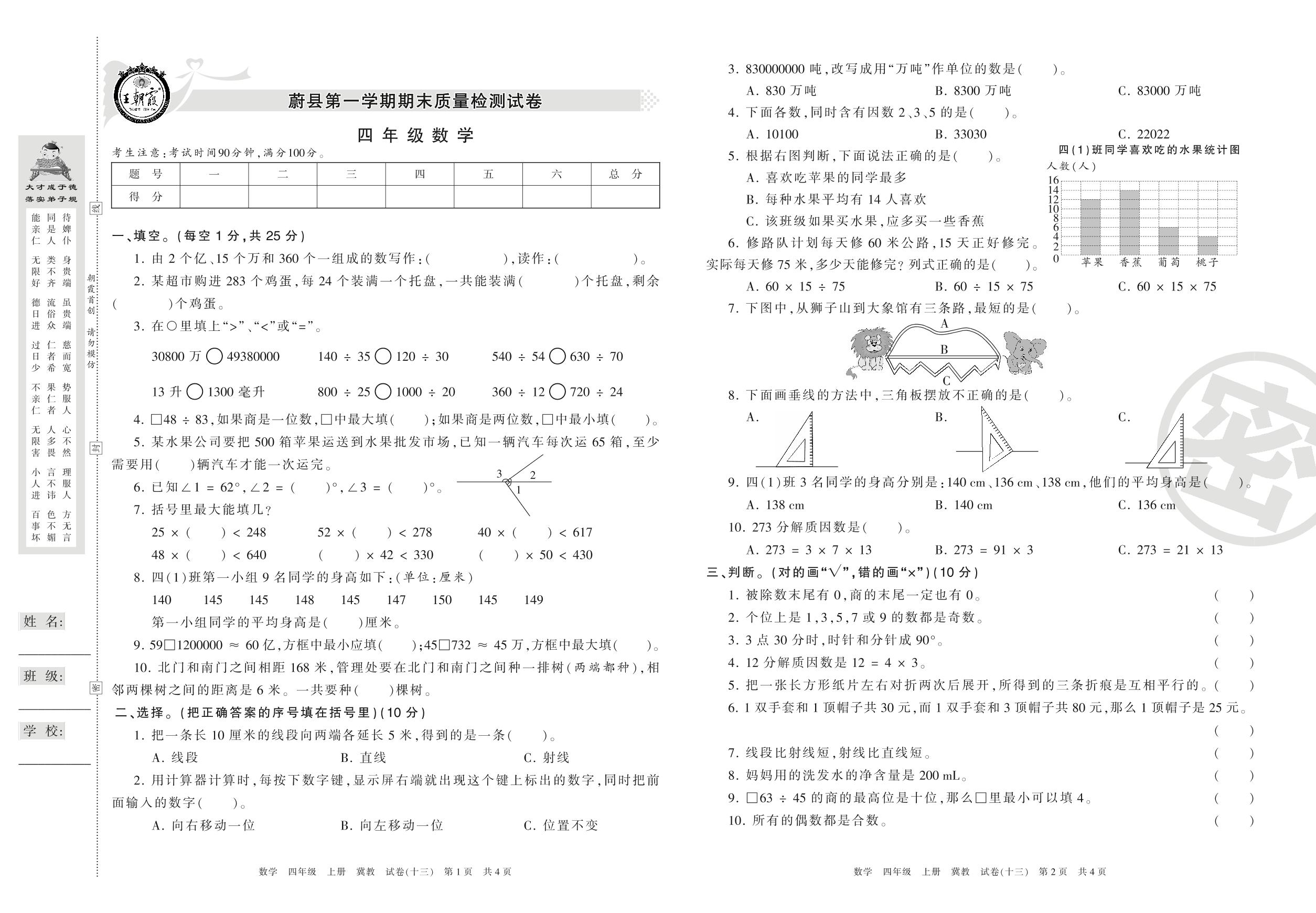 2016-2017学年第一学期张家口市蔚县四年级数学试卷(冀教版)【13】