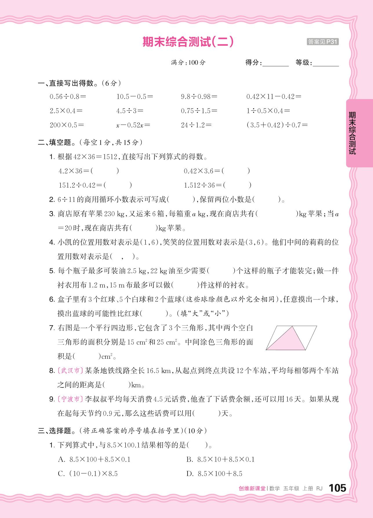 2024秋上册五年级数学人教版 期末综合测试(二)
