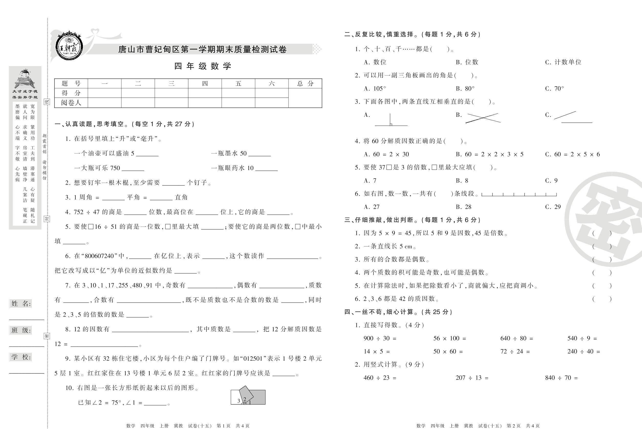 2016-2017学年第一学期唐山市曹妃甸区四年级数学试卷(冀教版)【15】