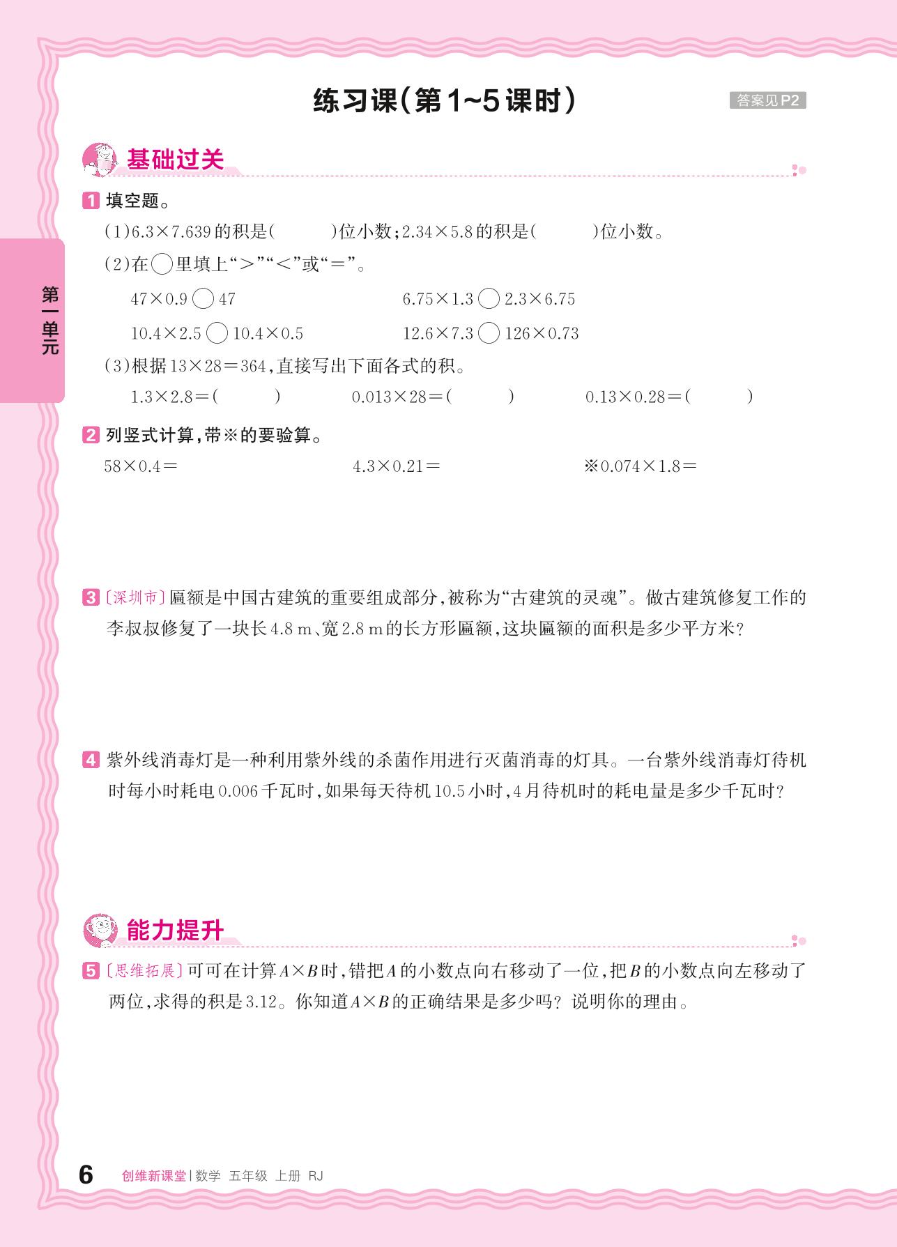 2024秋上册五年级数学人教版 第一单元 小数乘法——小数乘整数、小数乘小数练习课