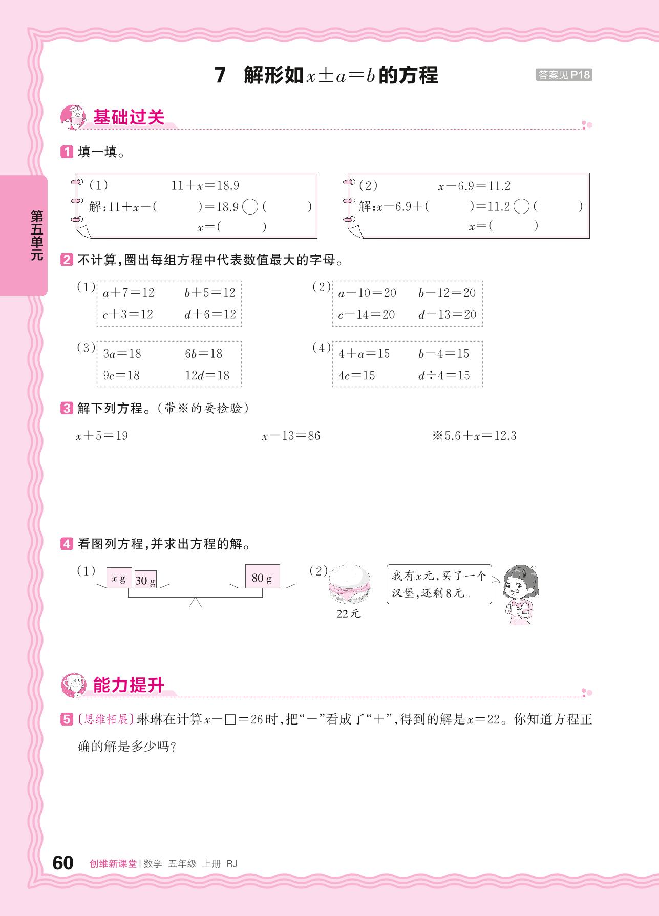2024秋上册五年级数学人教版 第五单元 简易方程——7. 解形如x±a=b的方程