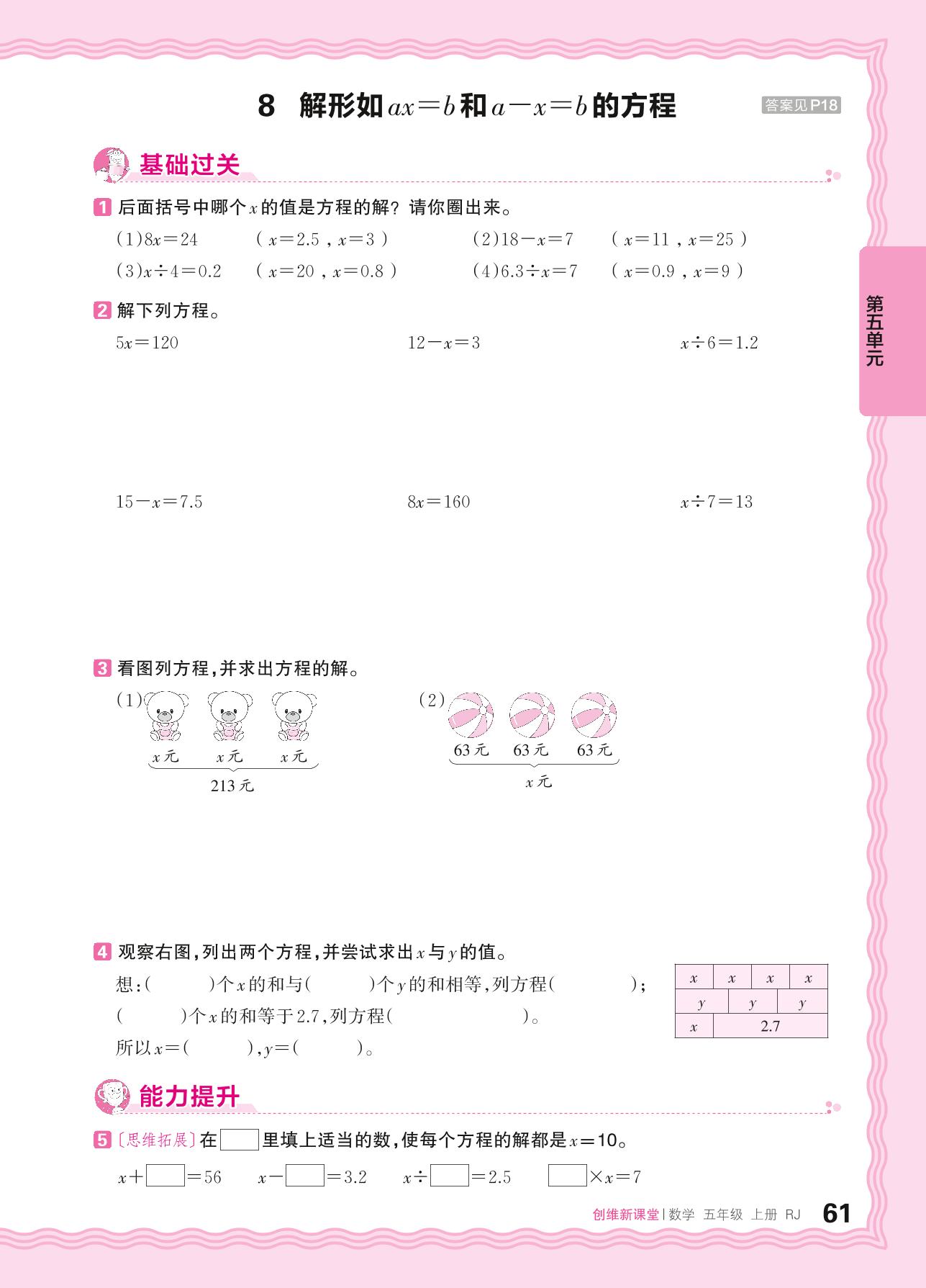 2024秋上册五年级数学人教版 第五单元 简易方程——8. 解形如ax=b和a-x=b的方程