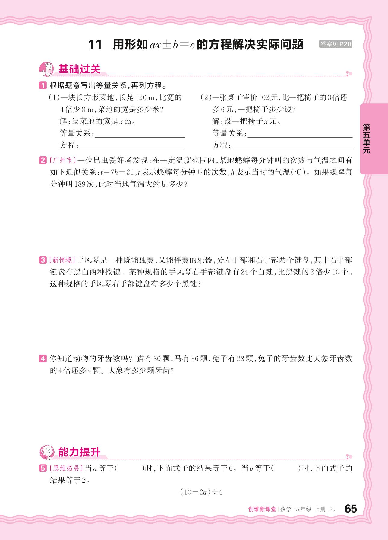 2024秋上册五年级数学人教版 第五单元 简易方程——11. 用形如ax±b=c的方程解决实际问题