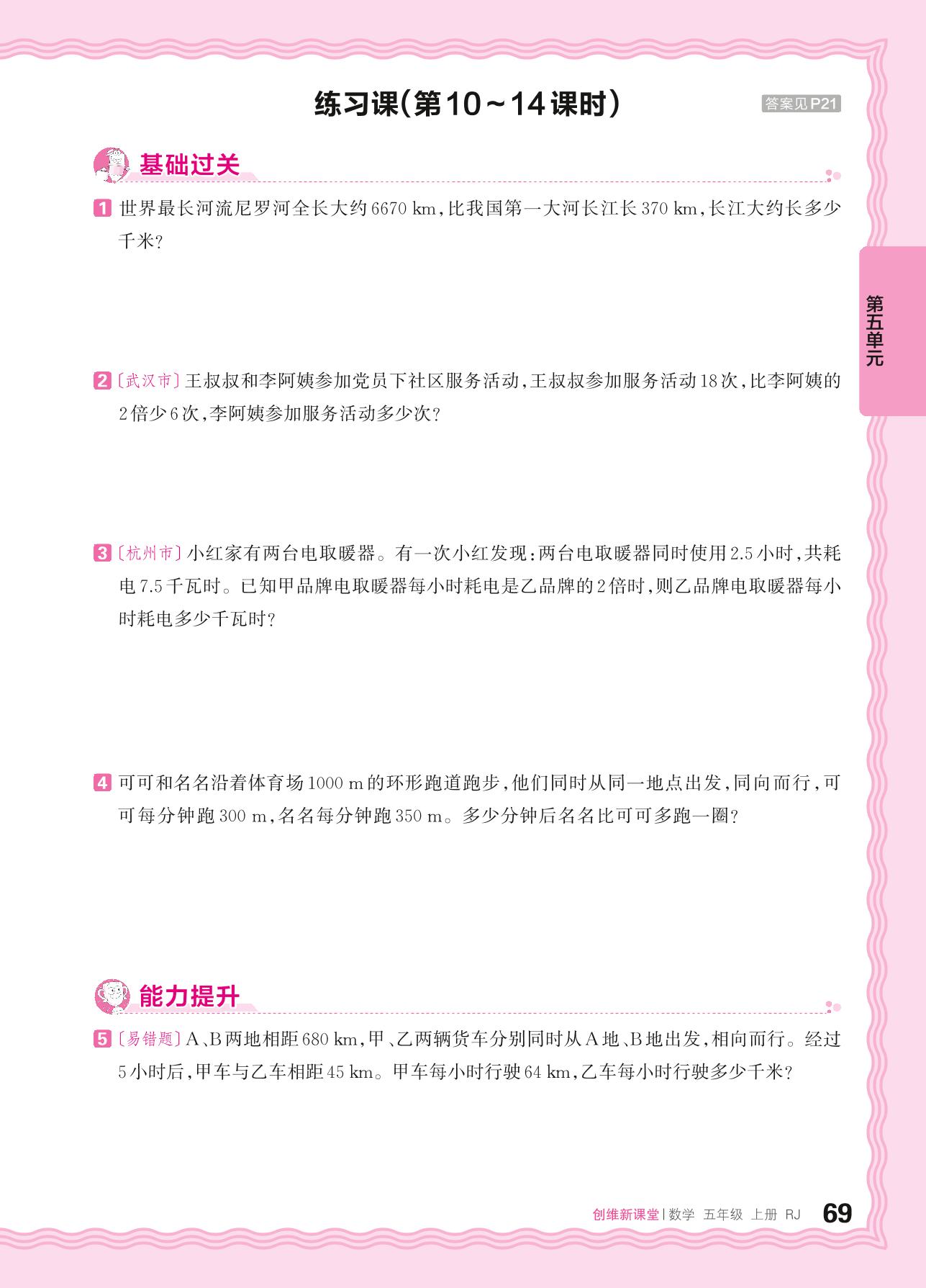 2024秋上册五年级数学人教版 第五单元 简易方程——用方程解决实际问题练习课