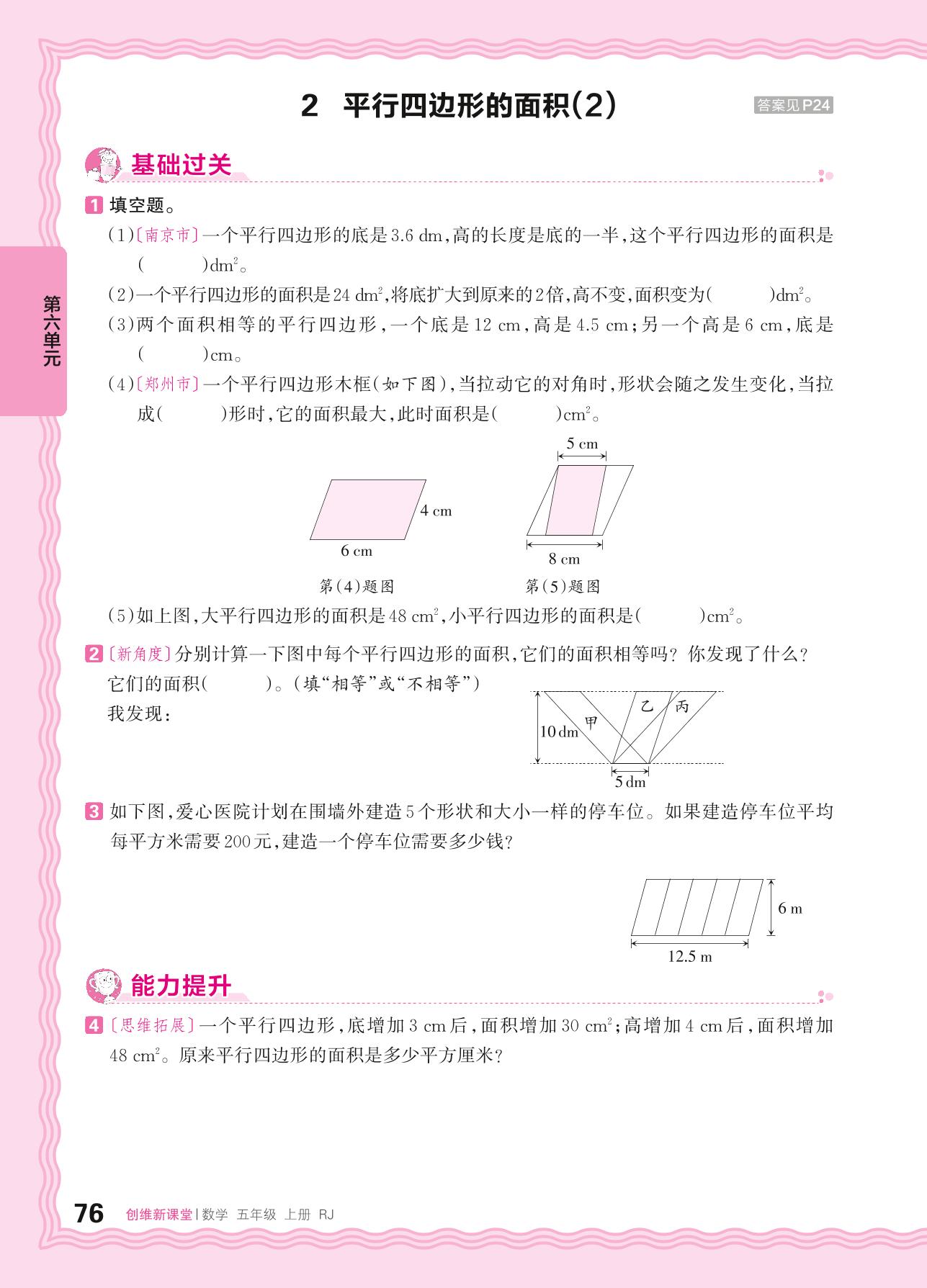2024秋上册五年级数学人教版 第六单元 多边形的面积——2. 平行四边形的面积(2)