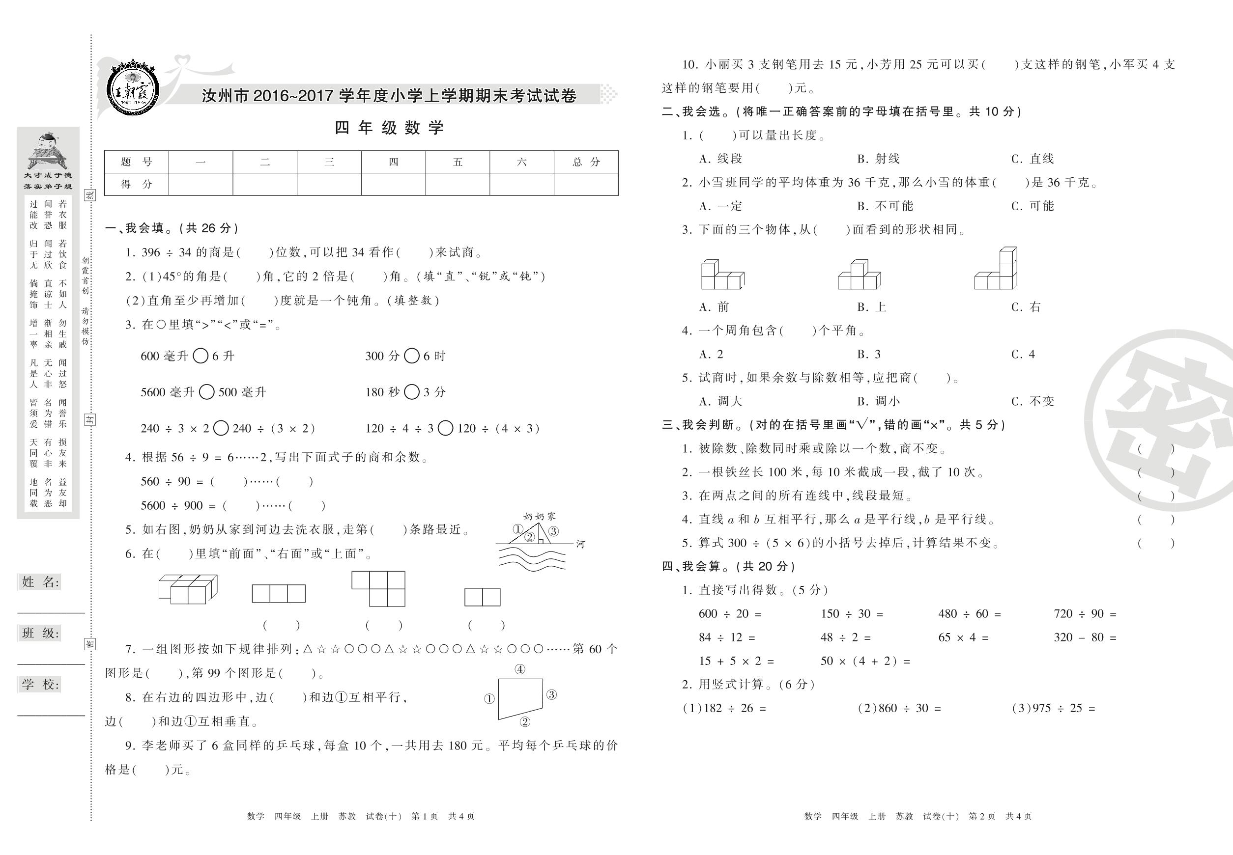 2016-2017学年第一学期汝州市四年级数学试卷(苏教版)【10】