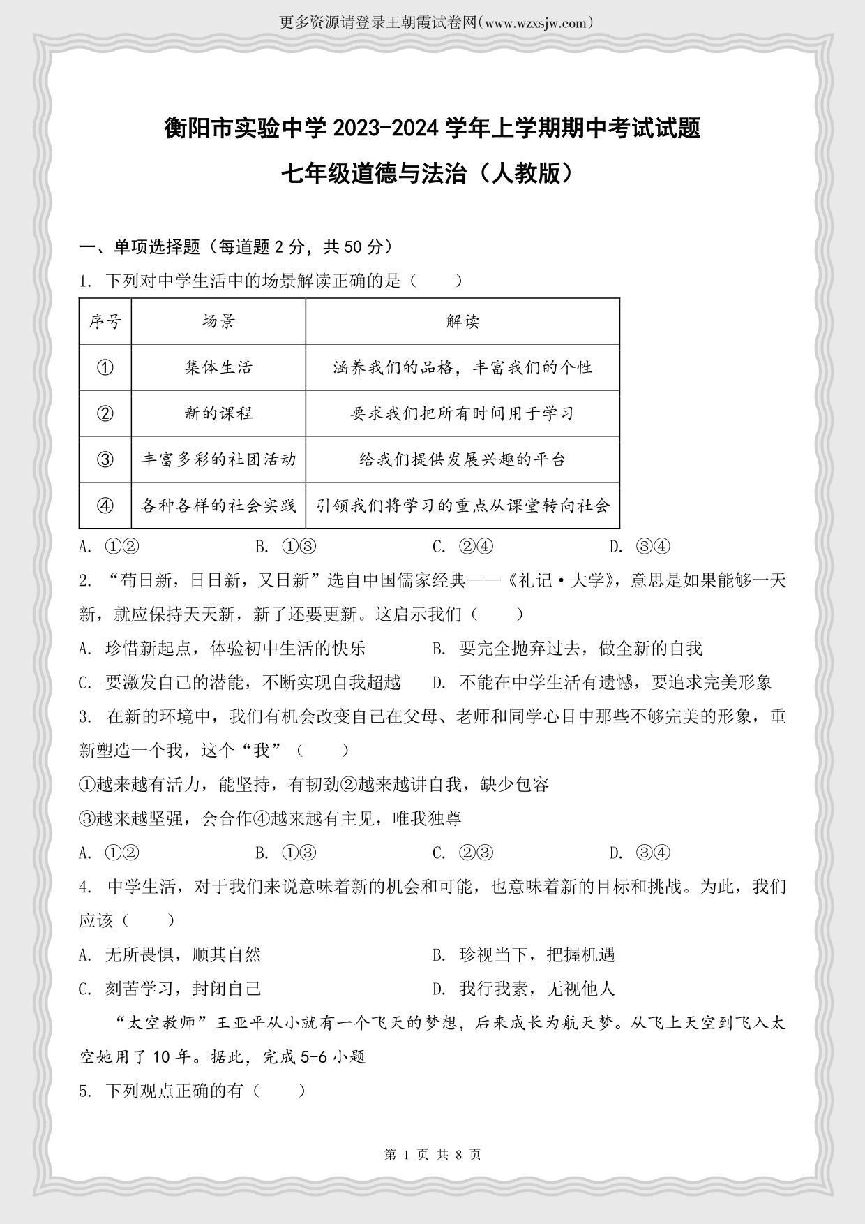 湖南省衡阳市实验中学2023-2024学年上学期期中考试试题七年级道德与法治(人教版)