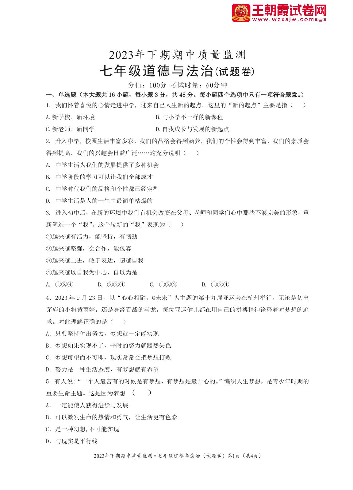 湖南省永州市道县2023-2024学年第一学期期中质量监测七年级道德与法治(人教版)