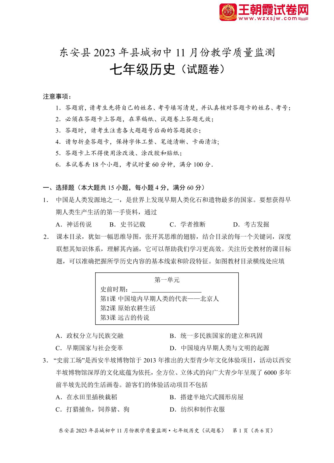 湖南省永州市东安县2023-2024学年上学期11月份期中教学质量检测七年级历史(人教版)