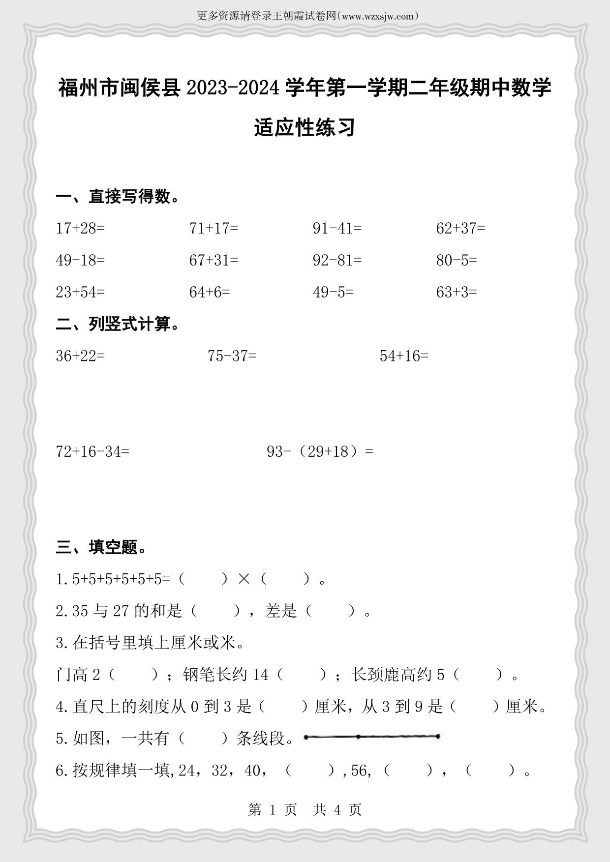福建省福州市闽侯县2023-2024学年第一学期期中适应性练习二年级数学(人教版)