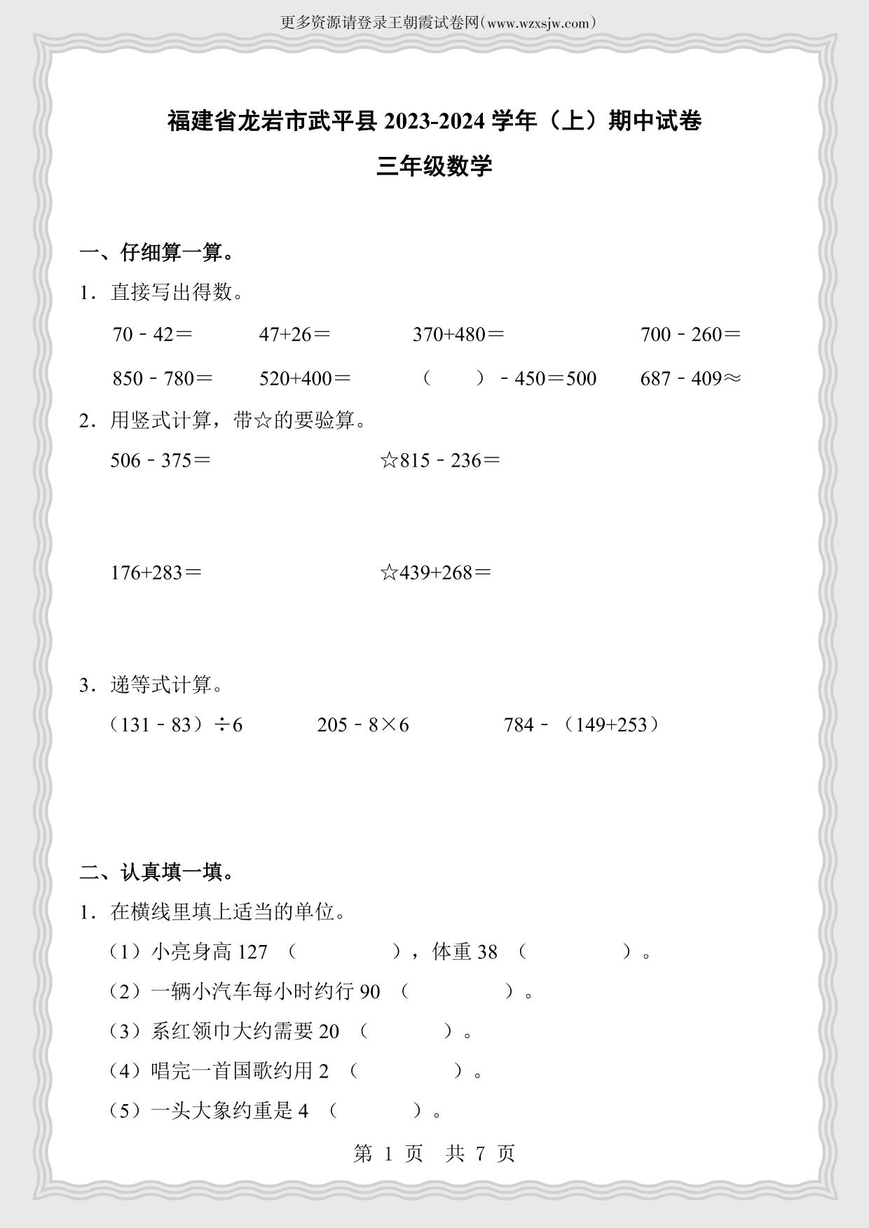 福建省龙岩市武平县2023-2024学年第一学期期中试卷三年级数学(人教版)
