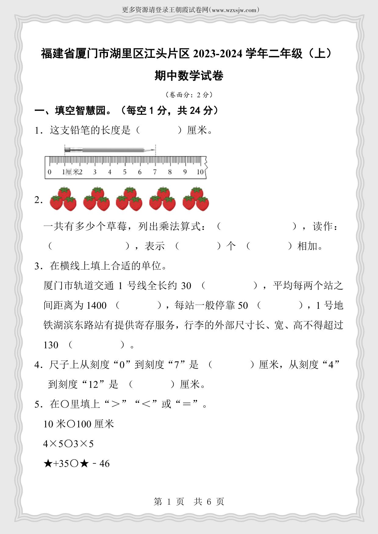 福建省厦门市湖里区江头片区2023-2024学年第一学期期中试卷二年级数学(人教版)