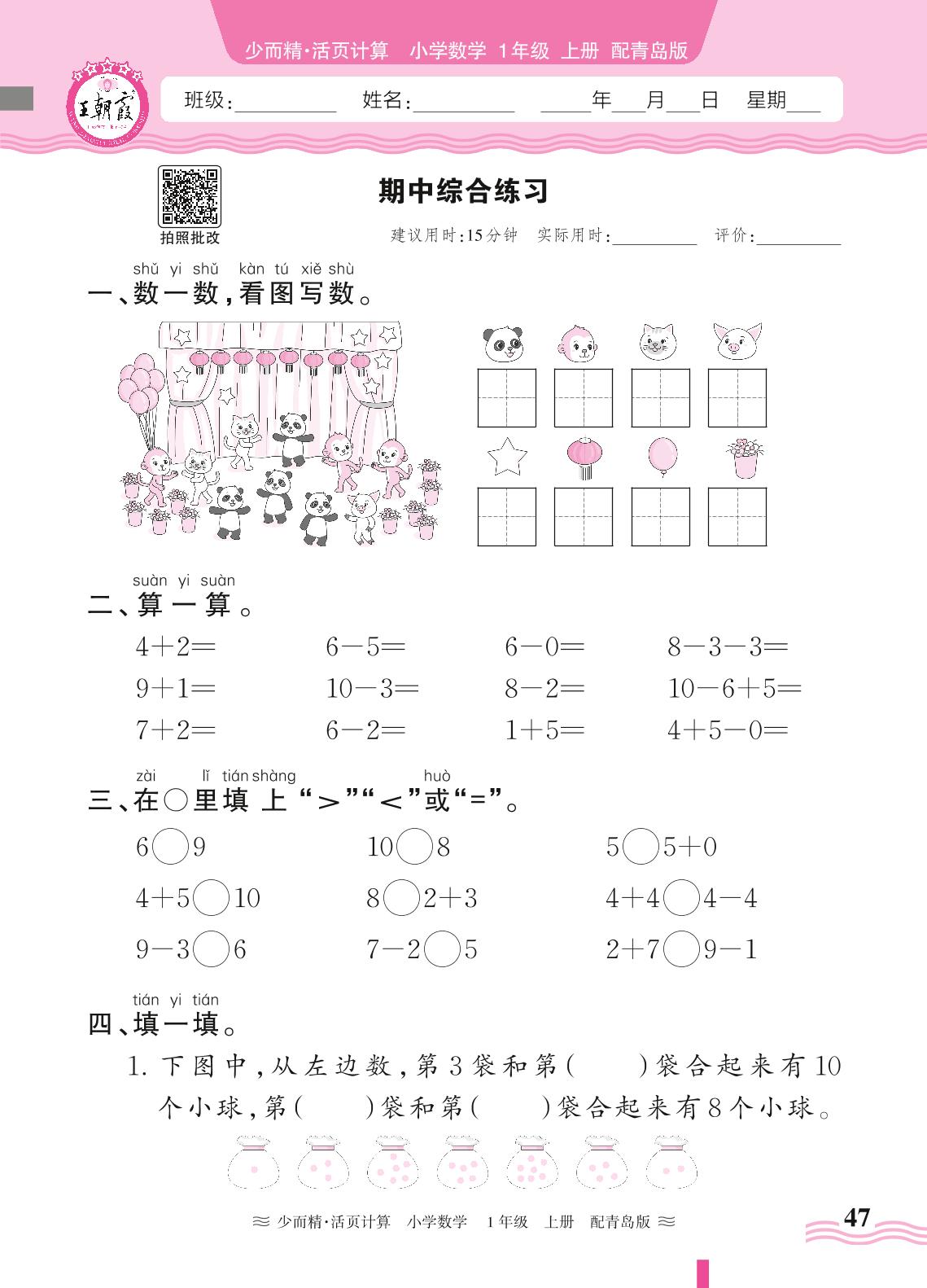 2024秋上册一年级数学青岛版 期中综合练习(计算专练)