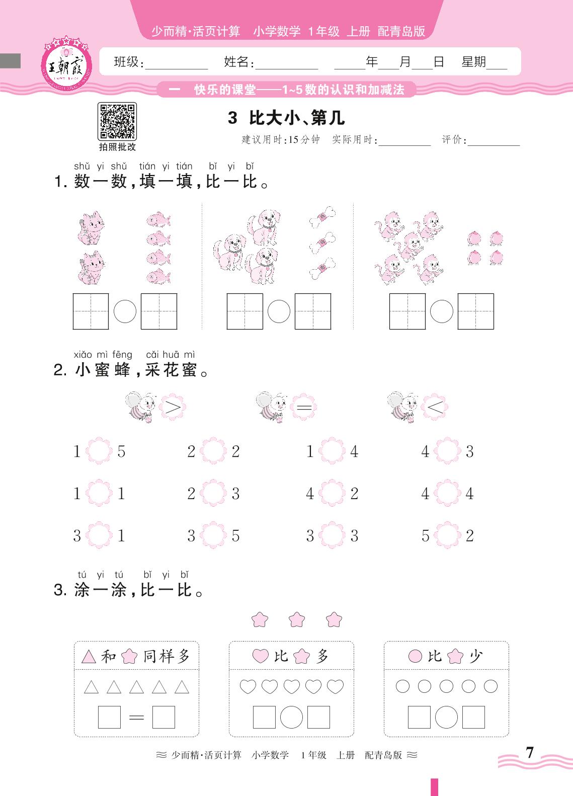 2024秋上册一年级数学青岛版 第一单元 快乐的课堂(1~5数的认识和加减法)——3. 比大小、第几