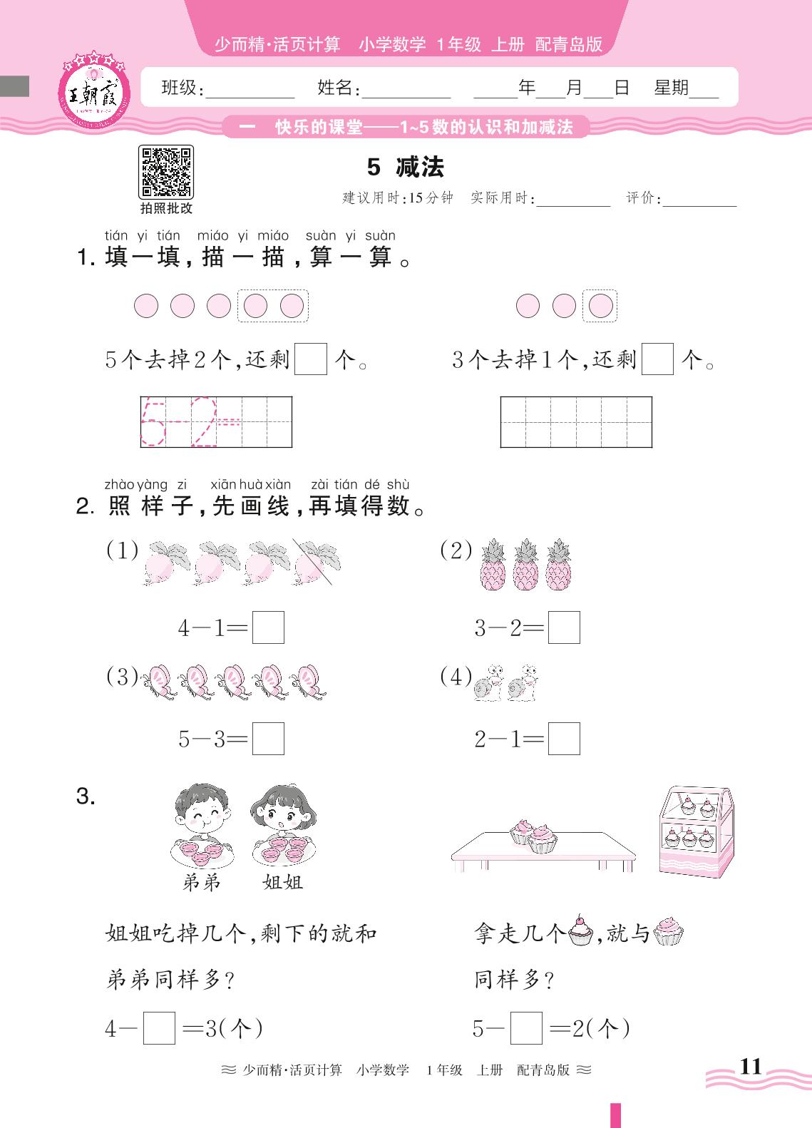 2024秋上册一年级数学青岛版 第一单元 快乐的课堂(1~5数的认识和加减法)——5. 减法