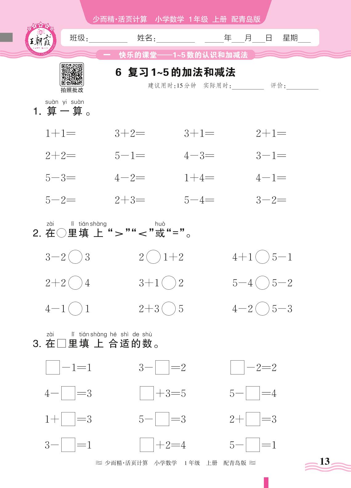 2024秋上册一年级数学青岛版 第一单元 快乐的课堂(1~5数的认识和加减法)——6. 复习1~5的加法和减法