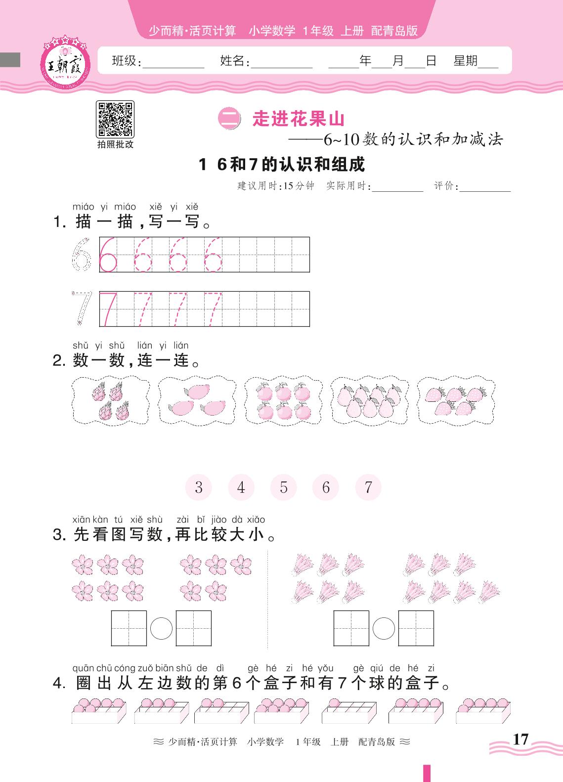 2024秋上册一年级数学青岛版 第二单元 走进花果山(6~10数的认识和加减法)——1. 6 和7的认识和组成
